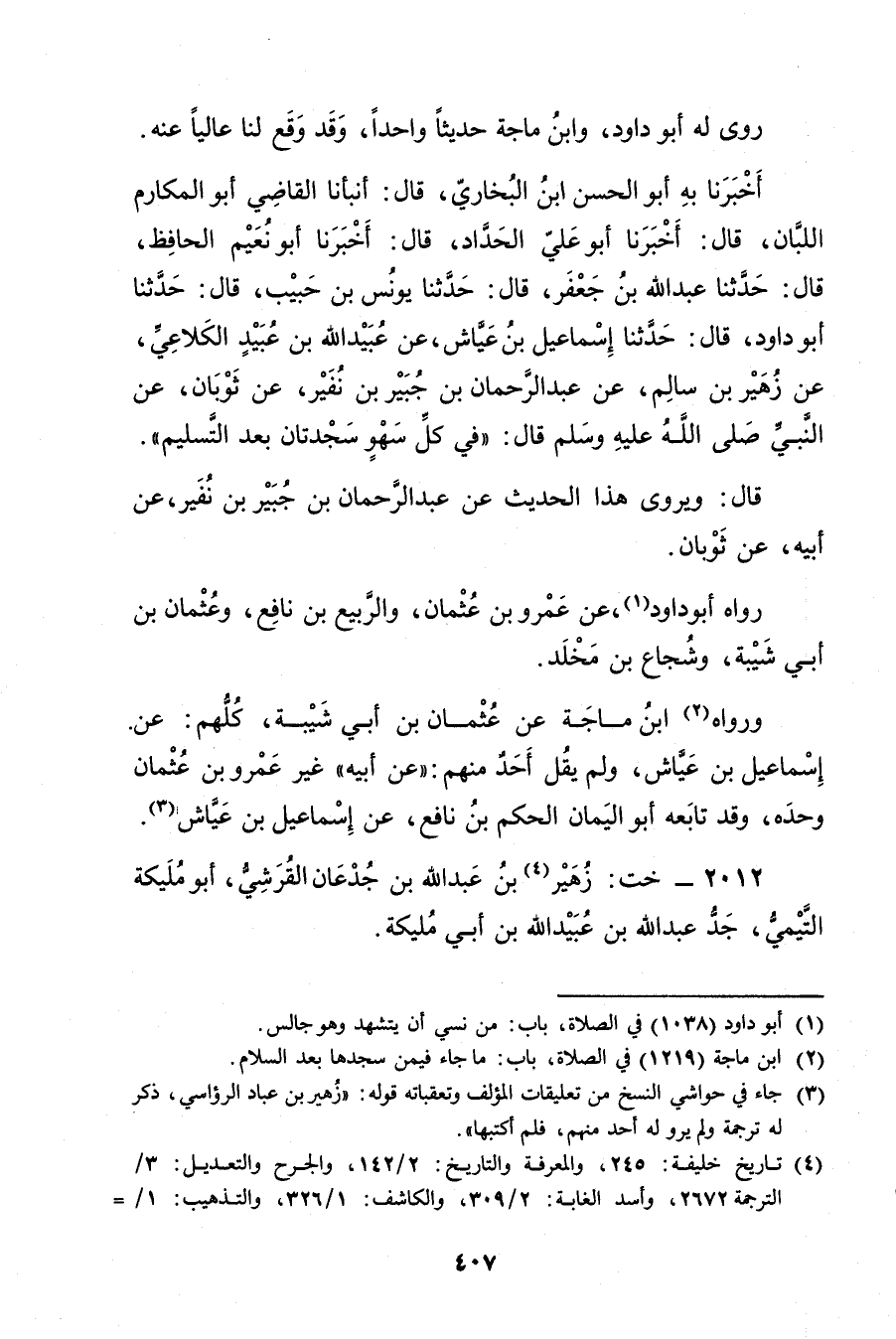 أَخْبَرَنَا بِهِ أبو الحسن بْن البخاري، قال: أَنْبَأَنَا القاضي أَبُو المكارم اللبان، قال: أَخْبَرَنَا أَبُو عَلِيّ الحداد، قال: أَخْبَرَنَا أَبُو نُعَيْمٍ الْحَافِظُ، قال: حَدَّثَنَا عَبد اللَّهِ بْن جَعْفَرٍ، قال: حَدَّثَنَا يُونُسُ بْنُ حَبِيبٍ، قال: حَدَّثَنَا أَبُو دَاوُدَ، قال: حَدَّثَنَا إسماعيل بْن عياش، عَنْ عُبَيد اللَّهِ بْنِ عُبَيد الْكُلاعِيِّ، عُنْ زُهَيْرِ بْنِ سَالِمٍ، عَنْ عَبْدِ الرَّحْمَنِ بْنِ جُبَيْرِ بْنِ نَفِيرٍ، عَنْ ثَوْبَانَ، عَنِ النَّبِيُّ صلى الله عليه وسلم قال: فِي كُلِّ سَهْوٍ سَجْدَتَانِ بَعْدَ التَّسْلِيمِ.