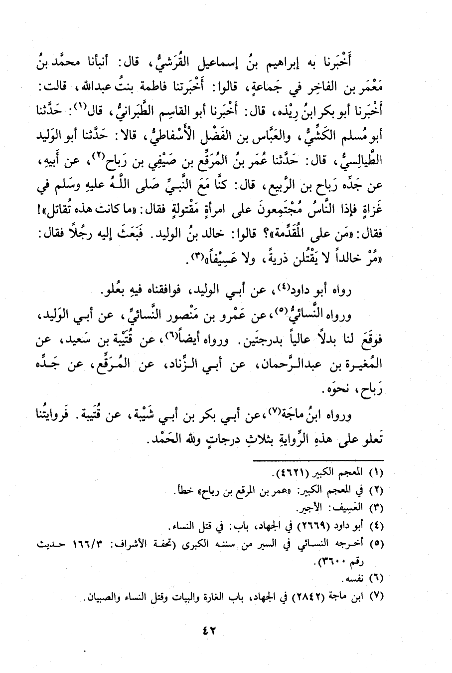 أَخْبَرَنَا بِهِ إِبْرَاهِيمُ بْنُ إِسْمَاعِيلَ الْقُرَشِيُّ، قال: أَنْبَأَنَا مُحَمَّدُ بْنُ مَعْمَرِ بْنِ الْفَاخِرِ فِي جَمَاعَةٍ، قَالُوا: أَخْبَرَتْنا فَاطِمَةُ بِنْتُ عَبد اللَّهِ، قَالَتْ: أخبرنا أَبُو بَكْرِ بْنِ رِيذَةَ، قال: أخبرنا أَبُو الْقَاسِمِ الطَّبَرَانِيُّ، قال (1) : حَدَّثَنَا أَبُو مُسْلِمٍ الْكَشِّيُّ، والْعَبَّاسُ بْنُ الْفَضْلِ الأَسْفَاطِيُّ، قَالا: حَدَّثَنَا أَبُو الْوَلِيدِ الطَّيَالِسِيُّ، قال: حَدَّثَنَا عُمَر بْنُ الْمُرَقَّعِ بْنِ صَيْفِيِّ بْنِ رَبَاحٍ (2) ، عَن أَبِيهِ، عَنْ جَدِّهِ رَبَاحِ بْنِ الرَّبِيعِ، قال: كُنَّا مَعَ النَّبِيُّ صلى الله عليه وسلم فِي غَزَاةٍ فَإِذَا النَّاسُ مُجْتَمِعُونَ عَلَى امْرَأَةٍ مَقْتُولَةٍ فَقَالَ: مَا كَانَتْ هَذِهِ تُقَاتِلُ"! فَقَالَ: مَنْ عَلَى الْمُقَدِّمَةِ"؟ قَالُوا: خَالِدُ بْنُ الْوَلِيدِ. فَبَعَثَ إِلَيْهِ رَجُلا فَقَالَ: مُرْ خَالِدًا لا يَقْتُلَنَّ ذُرِّيَّهً، ولا عَسِيفًا" (3) .