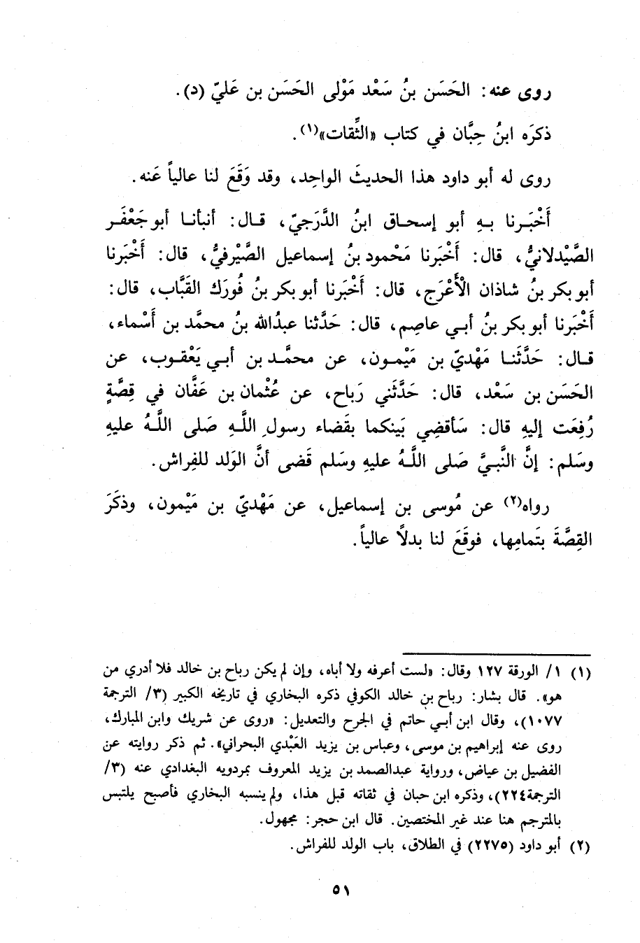 أَخْبَرَنَا بِهِ أَبُو إِسْحَاقَ ابْنُ الدَّرَجِيِّ، قال: أَنْبَأَنَا أَبُو جَعْفَرٍ الصَّيْدَلانِيُّ، قال: أَخْبَرَنَا مَحْمُودُ بْنُ إِسْمَاعِيلَ الصَّيْرَفِيُّ، قال: أَخْبَرَنَا أَبُو بَكْرِ بْنُ شَاذَانَ الأَعْرَجُ، قال: أَخْبَرَنَا أَبُو بَكْرِ بْنُ فُوُرَكَ الْقَبَّابُ، قال: أَخْبَرَنَا أَبُو بَكْر بْن أَبي عاصم، قال: حَدَّثَنَا عَبد اللَّهِ بْن مُحَمَّدِ بْنِ أَسْمَاءَ، قال: حَدَّثَنَا مَهْدِيُّ بْنُ مَيْمُونٍ، عَنْ مُحَمَّدِ بْنِ أَبي يَعْقُوبَ، عن الْحَسَنِ بْنِ سَعْدٍ، قال: حَدَّثَنِي رَبَاحٌ، عَنْ عُثْمَانَ بْنِ عَفَّانَ فِي قِصْةٍ رُفِعَتْ إِلَيْهِ قال: سَأَقْضِي بَيْنَكُمَا بِقَضَاءِ رَسُولِ اللَّهِ صَلَّى اللَّهُ عَلَيْه وسَلَّمَ: أَنَّ النَّبِيَّ صَلَّى اللَّهُ عَلَيْهِ وسَلَّمَ قَضَى إِنَّ الْوَلَدَ لِلْفِرَاشِ.