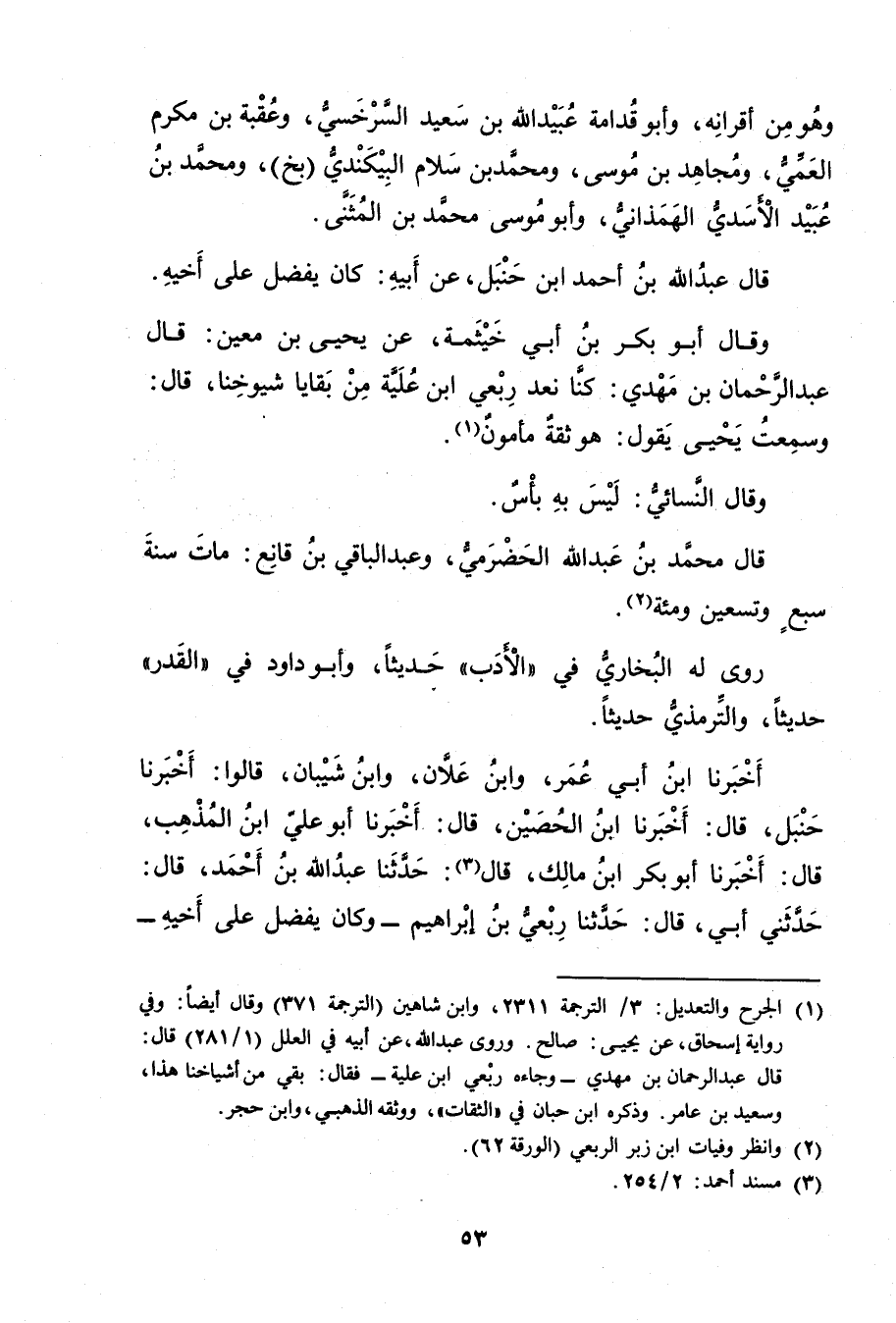 أخبرنا ابْنُ أَبي عُمَر، وابْنُ علان، وابن شيبان، قَالُوا: أخبرنا حنبل، قال: أخبرنا ابن الحصين، قال: أَخْبَرَنَا أَبُو عَلِيِّ ابْنُ الْمُذْهِب، قال: أَخْبَرَنَا أبو بكر بْن مالك، قال (3) : حَدَّثَنَا عَبد اللَّهِ بْن أَحْمَدَ، قال: حَدَّثني أَبِي، قال: حَدَّثَنَا رَبْعِيُّ بْنُ إِبْرَاهِيمَ - وكَانَ يَفْضُلُ عَلَى أَخِيهِ -
