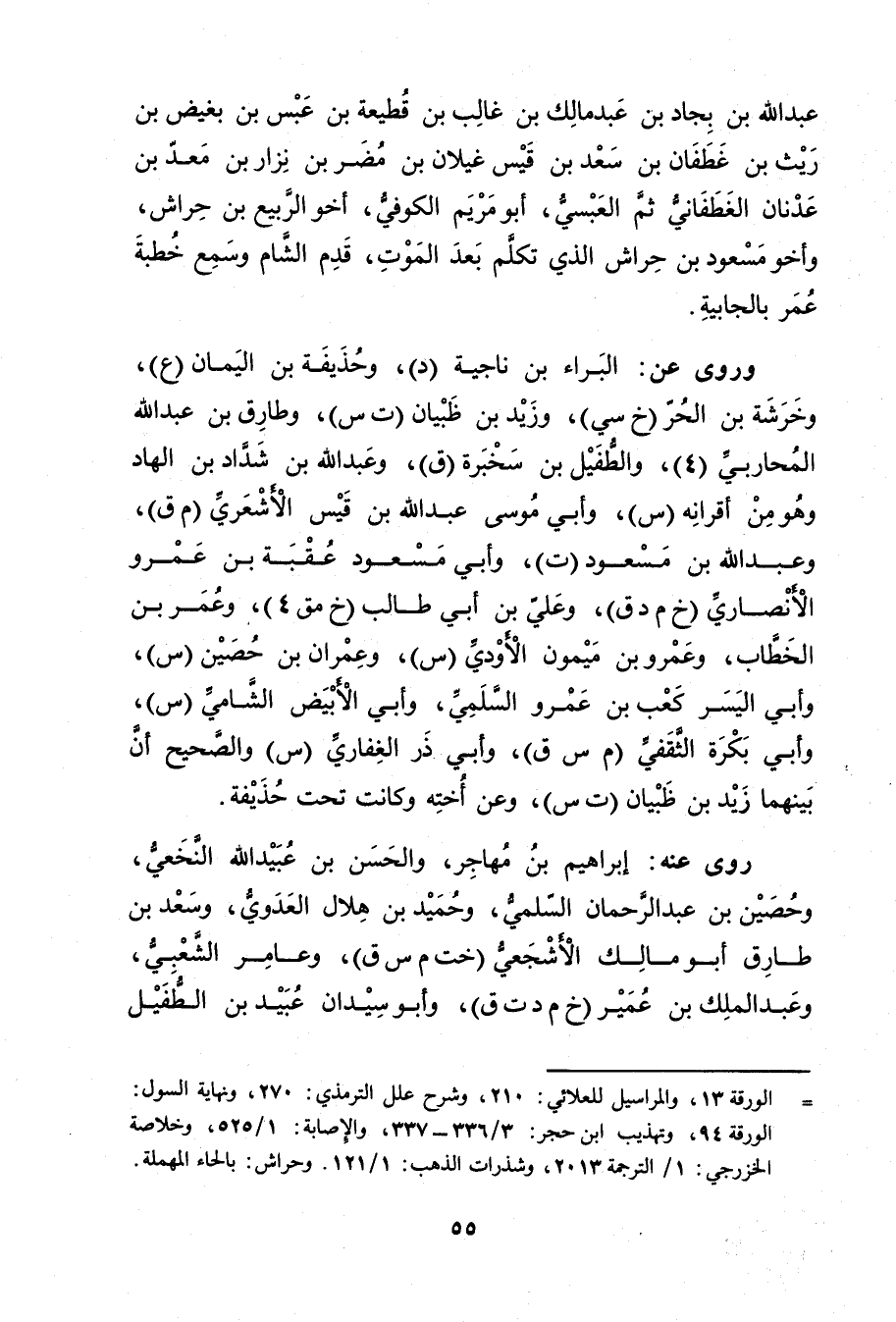 = الورقة 13، والمراسيل للعلائي: 210، وشرح علل التِّرْمِذِيّ: 270، ونهاية السول: الورقة 94، وتهذيب ابن حجر: 3 / 336 - 337، والاصابة: 1 / 525، وخلاصة الخزرجي: 1 / الترجمة 2013، وشذرات الذهب: 1 / 121. وحراش: بالحاء المهملة.