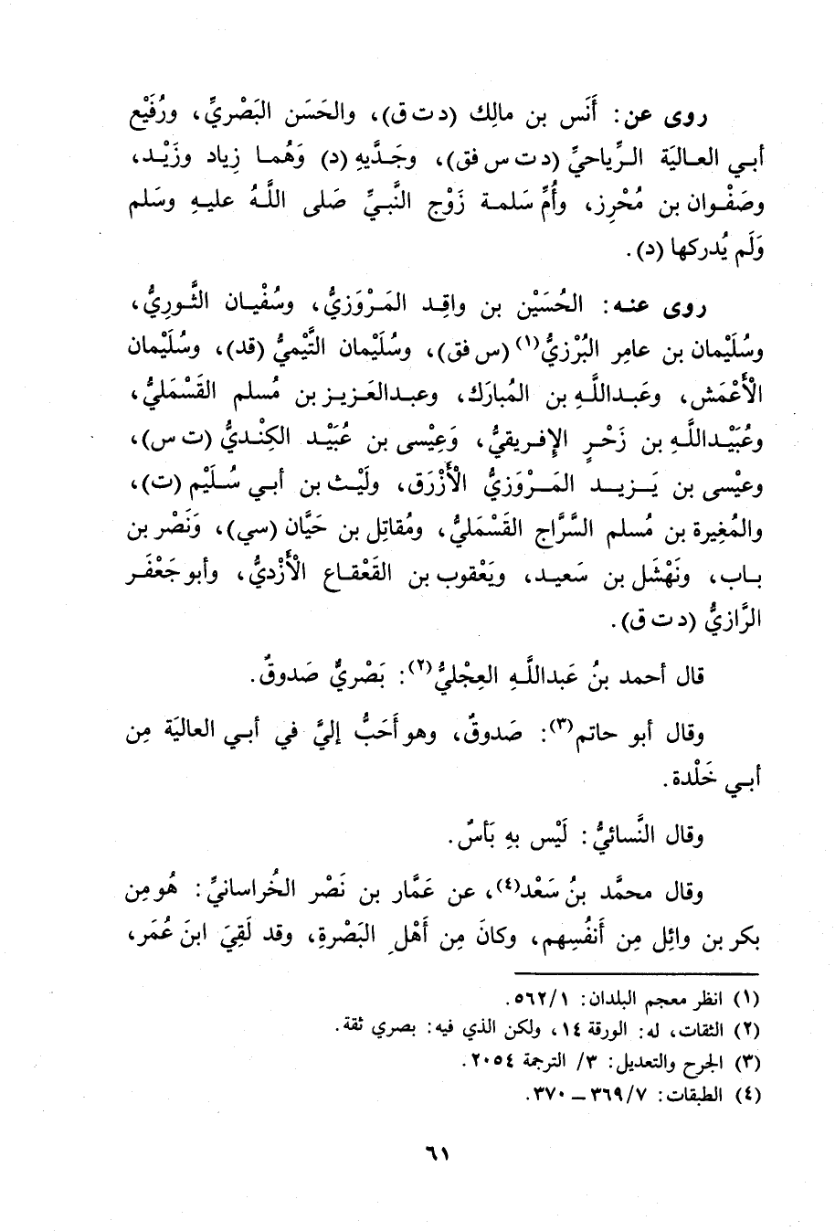 وَقَال أبو حاتم (3) : صدوق، وهو أحب إلي في أبي العالية من أبي خلده.