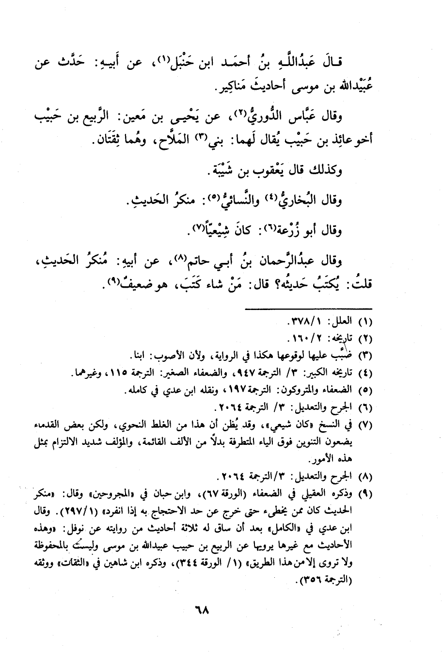 (9) وذكره العقيلي في الضعفاء (الورقة 67) ، وابن حبان في "المجروحين"وَقَال: منكر الحديث كان ممن يخطئ حتى خرج عن حد الاحتجاج به إذا انفرد" (1 / 297) . وَقَال ابن عدي في "الكامل"بعد أن ساق له ثلاثة أحاديث من روايته عن نوفل: وهذه الاحاديث مع غيرها يرويها عن الربيع بن حبيب عُبَيد الله بن موسى وليست بالمحفوظة ولا تروى إلا من هذا الطريق" (1 / الورقة 344) ، وذكره ابن شاهين في "الثقات" ووثقه (الترجمة 356) .