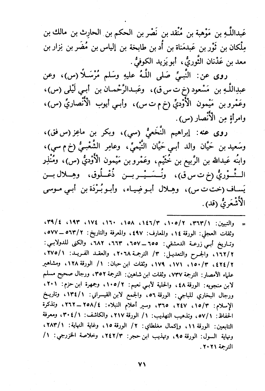 = والتبيين: 1 / 363، 2 / 105، 3 / 146، 158، 160، 174، 193، 4 / 39، وثقات العجلي: الورقة 14، والمعارف: 497، والمعرفة والتاريخ: 2 / 563 - 577، وتاريخ أبي زرعة الدمشقي: 655 - 657، 663، 682، والكنى للدولابي: 2 / 162، والجرح والتعديل: 3 / الترجمة 2068، والعقد الفريد: 1 / 275، 2 / 424، 3 / 150، 171، 179، وثقات ابن حبان: 1 / الورقة 128، ومشاهير علماء الامصار: الترجمة 737، وثقات ابن شاهين: الترجمة 352، ورجال صحيح مسلم لابن منجويه: الورقة 48، والحلية لابي نعيم: 2 / 105، وجمهرة ابن حزم: 201، ورجال البخاري للباجي: الورقة 56، والجمع لابن القيسراني: 1 / 134، وتاريخ الاسلام: 3 / 15، 247، 365، وسير أعلام النبلاء: 4 / 258 - 262، وتذكرة الحفاظ: 1 / 57، وتذهيب التهذيب: 1 / الورقة 217، والكاشف: 1 / 304، ومعرفة التابعين: الورقة 11، وإكمال مغلطاي: 2 / الورقة 15، وغاية النهاية: 1 / 283، ونهاية السول: الورقة 95، وتهذيب ابن حجر: 3 / 242، وخلاصة الخزرجي: 1 / الترجمة 2021.