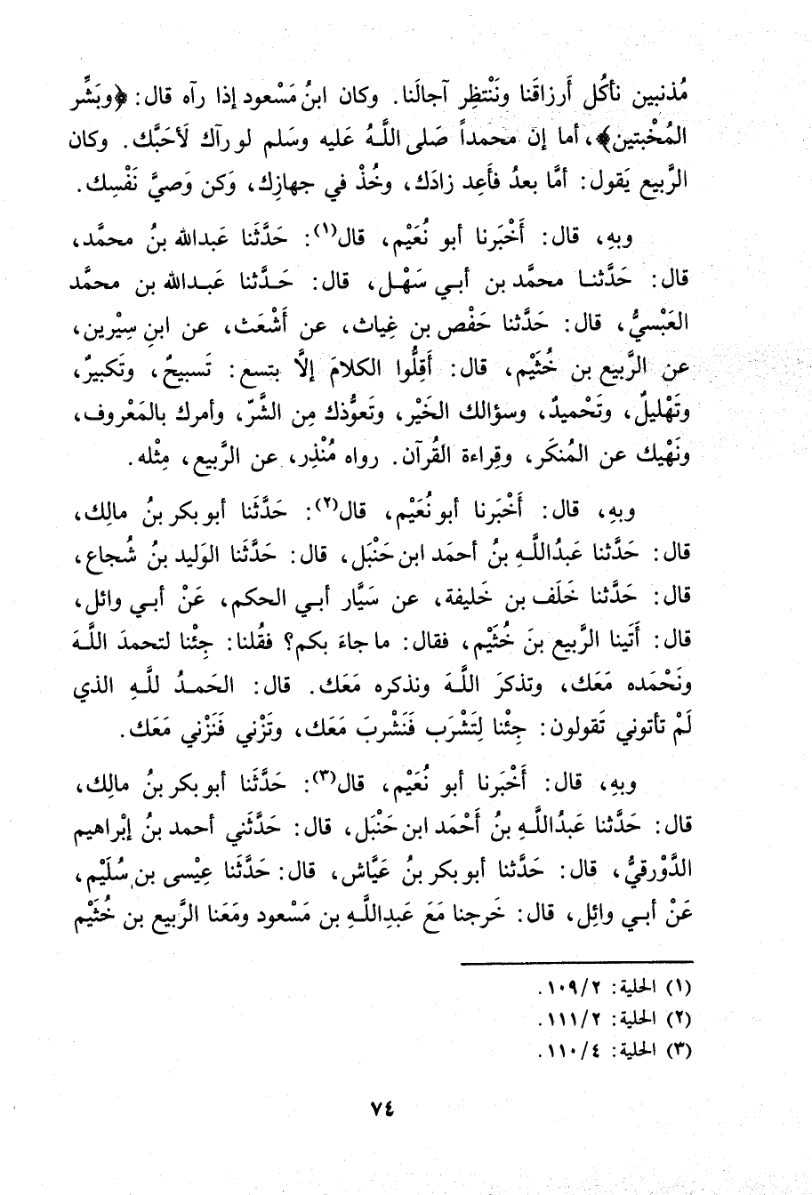 وبه، قال: أَخْبَرَنَا أَبُو نُعَيْمٍ، قال (3) : حَدَّثَنَا أبو بكر بْن مالك، قال: حَدَّثَنَا عَبد الله بْن أَحْمَد بْن حنبل، قال: حَدَّثَنِي أحمد بْن إبراهيم الدورقي، قال: حَدَّثَنَا أبو بكر بْن عياش، قال: حَدَّثَنَا عيسى بْن سليم، عَن أبي وائل، قال: خرجنا مع عَبد الله بْن مسعود ومعنا الربيع بْن خثيم
