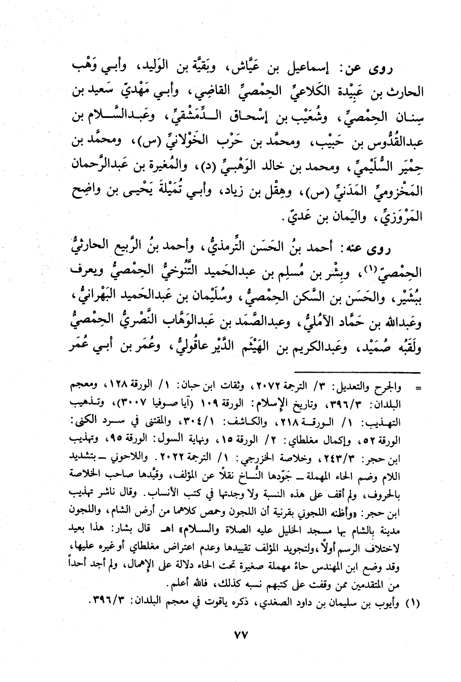 = والجرح والتعديل: 3 / الترجمة 2072، وثقات ابن حبان: 1 / الورقة 128، ومعجم البلدان: 3 / 396، وتاريخ الاسلام: الورقة 109 (آيا صوفيا 3007) ، وتذهيب التهذيب: 1 / الورقة 218، والكاشف: 1 / 304، والمقتنى في سرد الكنى: الورقة 52، وإكمال مغلطاي: 2 / الورقة 15، ونهاية السول: الورقة 95، وتهذيب ابن حجر: 3 / 243، وخلاصة الخزرجي: 1 / الترجمة 2022. واللاحوني - بتشديد اللام وضم الحاء المهملة - جودها النساخ نقلا عن المؤلف، وقيدها صاحب الخلاصة بالحروف، ولم أقف على هذه النسبة ولا وجدتها في كتب الانساب. وَقَال ناشر تهذيب ابن حجر: وأظنه اللجوني بقرنية أن اللجوني وحمص كلاهما من أرض الشام، واللجون مدينة بالشام بها مسجد الخليل عليه الصلاة والسلام"اه قال بشار: هذا بعيد لاختلاف الرسم أولا، ولتجويد المؤلف تقييدها وعدم اعتراض مغلطاي أو غيره عليها، وقد وضع ابن المهندس حاء مهملة صغيرة تحت الحاء دلالة على الاهمال، ولم أجد أحدًا من المتقدمين ممن وقفت على كتبهم نسبه وكذلك، فالله أعلم.