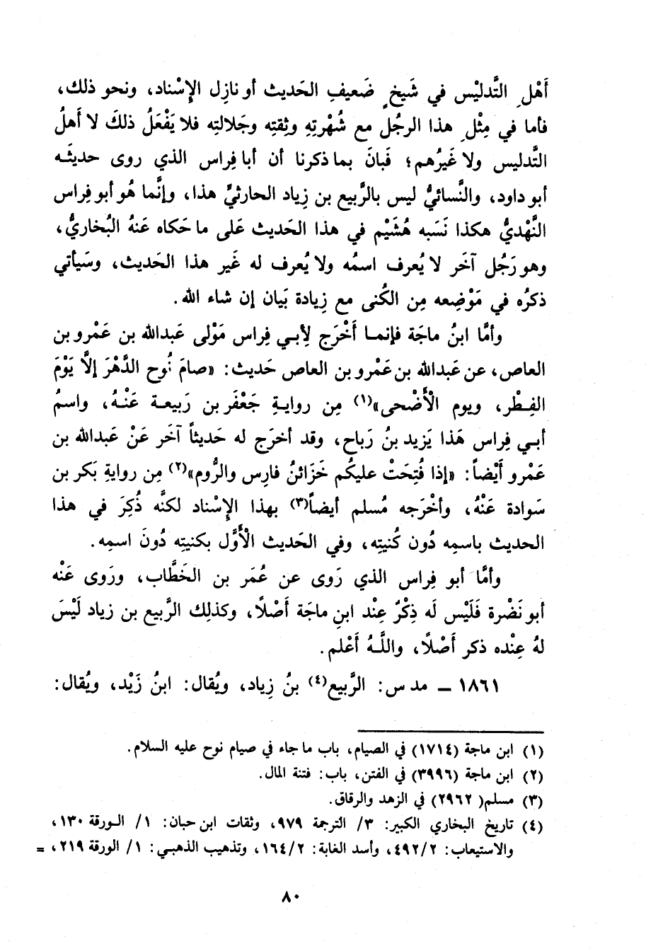 وأما ابْن ماجه فإنما اخرج لأبي فراس مولى عَبد الله بْن عَمْرو بْن العاص، عن عَبد الله بْن عَمْرو بْن العاص حديث: صام نوح الدهر إلا يوم الفطر، ويوم الأضحى" (1) من رواية جعفر بْن ربيعة عنه، واسم أبي فراس هذا يزيد بْن رباح، وقد أخرج له حديثا أخر عن عَبد الله بْن عَمْرو أيضا: إذا فتحت عليكم خزائن فارس والروم" (2) من رواية بكر بْن سواده عنه، وأخرجه مسلم أيضا (3) بهذا الإسناد لكنه ذكر في هذا الحديث باسمه دون كنيته، وفي الحديث الأول بكنيته دون اسمه.
