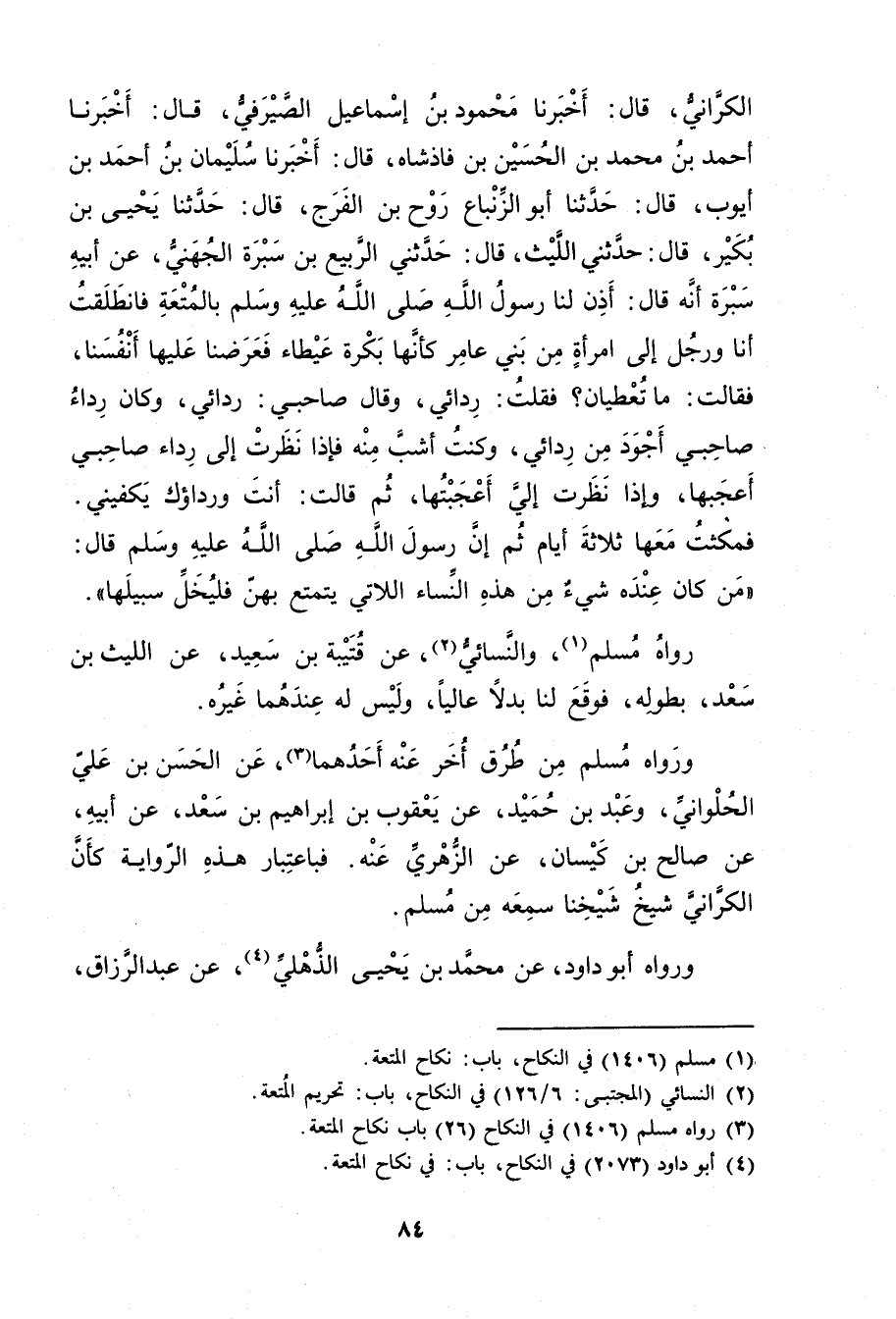الْكَرَّانِيُّ، قال: أَخْبَرَنَا مَحْمُودُ بْنُ إِسْمَاعِيلَ الصَّيْرَفِيُّ، قال: أَخْبَرَنَا أَحْمَدُ بْنُ مُحَمَّدِ بْنِ الْحُسَيْنِ بْنُ فَاذْشَاهِ، قال: أَخْبَرَنَا سُلَيْمان بْن أَحْمَد بْن أيوب، قال: حَدَّثَنَا أبوالزنباع رَوْحُ بْنُ الْفَرَجِ، قال: حَدَّثَنَا يَحْيَى بْنُ بُكَيْرٍ، قال: حَدَّثَنِي اللَّيْثُ، قال: حَدَّثَنِي الرَّبِيعُ بْنُ سبرة الْجُهَنِيُّ، عَن أَبِيهِ سبرة أَنَّهُ قال: أَذِنَ لَنَا رَسُولُ اللَّهِ صلى الله عليه وسلم بِالْمُتْعَة فَانْطَلَقْتُ أَنَا ورَجُلٌ إِلَى امْرَأَهٍ مِنْ بَنِي عَامِرٍ كَأَنَّهَا بكرة عطاء فَعَرَضْنَا عَلَيْهَا أَنْفُسَنَا، فَقَالَتْ: مَا تُعْطِيانِ؟ فَقُلْتُ: رِدَائِي، وَقَال صَاحِبِي: رِدَائِي، وكَانَ رِدَاءُ صَاحِبِي أَجْوَدَ مِنْ رِدَائِي، وكُنْتُ أَشَّبَّ مِنْهُ فَإِذَا نَظَرَتْ إِلَى رِدَاءِ صَاحِبِي أَعْجَبَهَا، وإِذَا نَظَرَتْ إِلَيَّ أَعْجَبْتُهَا، ثُمَّ قَالَتْ: أَنْتَ ورِدَاؤُكَ يَكْفِينِي. فَمَكَثْتُ مَعَهَا ثَلاثَةَ أَيَّامٍ ثُمَّ أن رَسُول اللَّهِ صَلَّى اللَّهُ عَلَيْهِ وسَلَّمَ قال: مَنْ كَانَ عِنْدَهُ شَيءٌ مِنْ هَذِهِ النِّسَاءِ اللاتي يَتَمَتَّعُ بِهِنَّ فَلْيُخَلِّ سَبِيلَهَا.