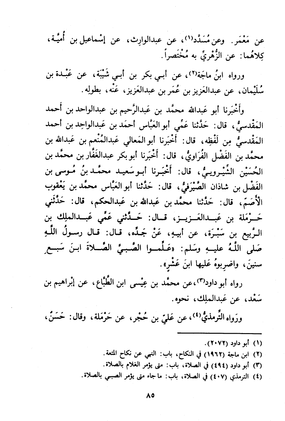 وأخبرنا أَبُو عَبْد اللَّه مُحَمَّد بْنُ عَبد الرَّحِيمِ بْنِ عَبْدِ الْوَاحِدِ بْنِ أَحْمَدَ الْمَقْدِسِيُّ، قال: حَدَّثَنَا عَمِّي أَبُو الْعَبَّاسِ أَحْمَدُ بْنِ عَبْدِ الْوَاحِدِ بْنِ أَحْمَدَ الْمَقْدِسِيُّ مِنْ لَفْظِهِ، قال: أخبرنا أَبُو الْمَعَالِي عَبْدُ الْمُنْعِمِ بْنُ عَبد اللَّهِ بْن مُحَمَّد بْن الْفَضْلِ الْفُرَاوِيُّ، قال: أَخْبَرَنَا أَبُو بَكْرٍ عَبْدُ الْغَفَّارِ بْنِ مُحَمَّدِ بن الحسين الشِّيرَوِييُّ، قال: أَخْبَرَنَا أَبُو سَعِيد مُحَمَّدُ بْنُ مُوسَى بْنِ الْفَضْلِ بْنِ شَاذَانَ الصَّيْرَفِيُّ، قال: حَدَّثَنَا أَبُو الْعَبَّاسِ مُحَمَّدُ بْنُ يَعْقُوبَ الأَصَمُّ، قال: حَدَّثَنَا مُحَمَّدُ بْنُ عَبد اللَّهِ بْن عبد الحكم، قال: حَدَّثَنِي حَرْمَلَةُ بْنُ عَبْدِ الْعَزِيزِ، قال: حَدَّثَنِي عَمِّي عَبد المَلِك بْن الربيع بْن سبرة، عَن أبيه، عن جده، قال: قال رَسُولُ اللَّهِ صلى الله عَلَيْه وسَلَّمَ: عَلِّمُوا الصَّبِيَّ الصَّلاةَ ابْنَ سَبْعِ سِنِينَ، واضْرِبُوهُ عَلَيْهَا ابْنَ عَشْرٍ.