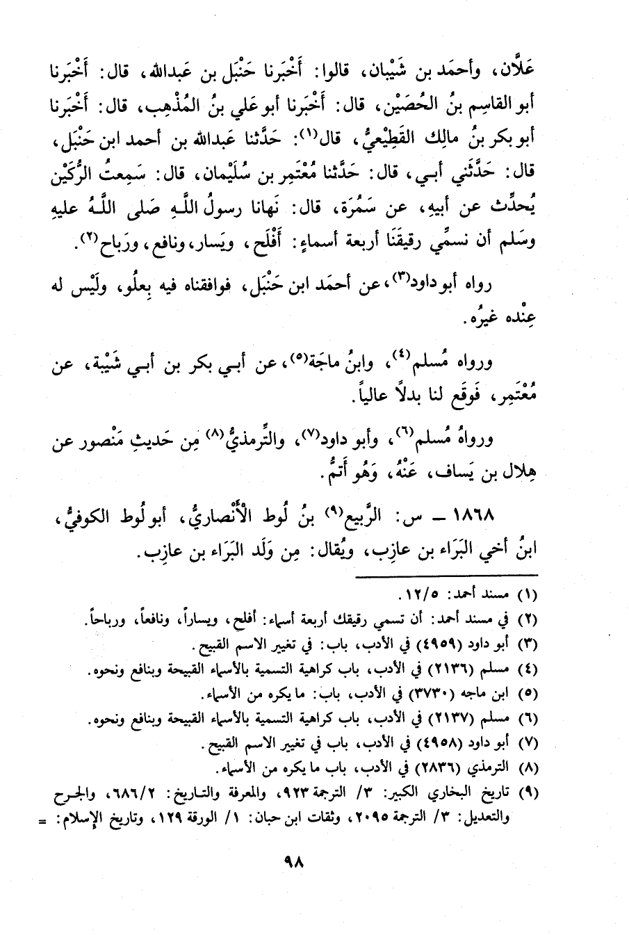 أبو بكر بْن مالك القَطِيعِيّ، قال (1) : حَدَّثَنَا عَبد اللَّهِ بْنُ أَحْمَدَ بْن حنبل، قال: حَدَّثني أبي، قال: حَدَّثَنَا مُعْتَمِرُ بْنُ سُلَيْمان، قال: سَمِعْتُ الرُّكَيْنَ يُحَدِّثُ عَن أَبِيهِ، عَنْ سَمُرَة، قال: نَهَانَا رَسُول اللَّهِ صلى الله عليه وسَلَّمَ أَنْ نُسَمِّيَ رَقِيقَنَا أَرْبَعَهَ أَسْمَاءٍ: أَفْلَحَ، ويَسَارَ، ونَافِعَ، ورَبَاحَ (2) .