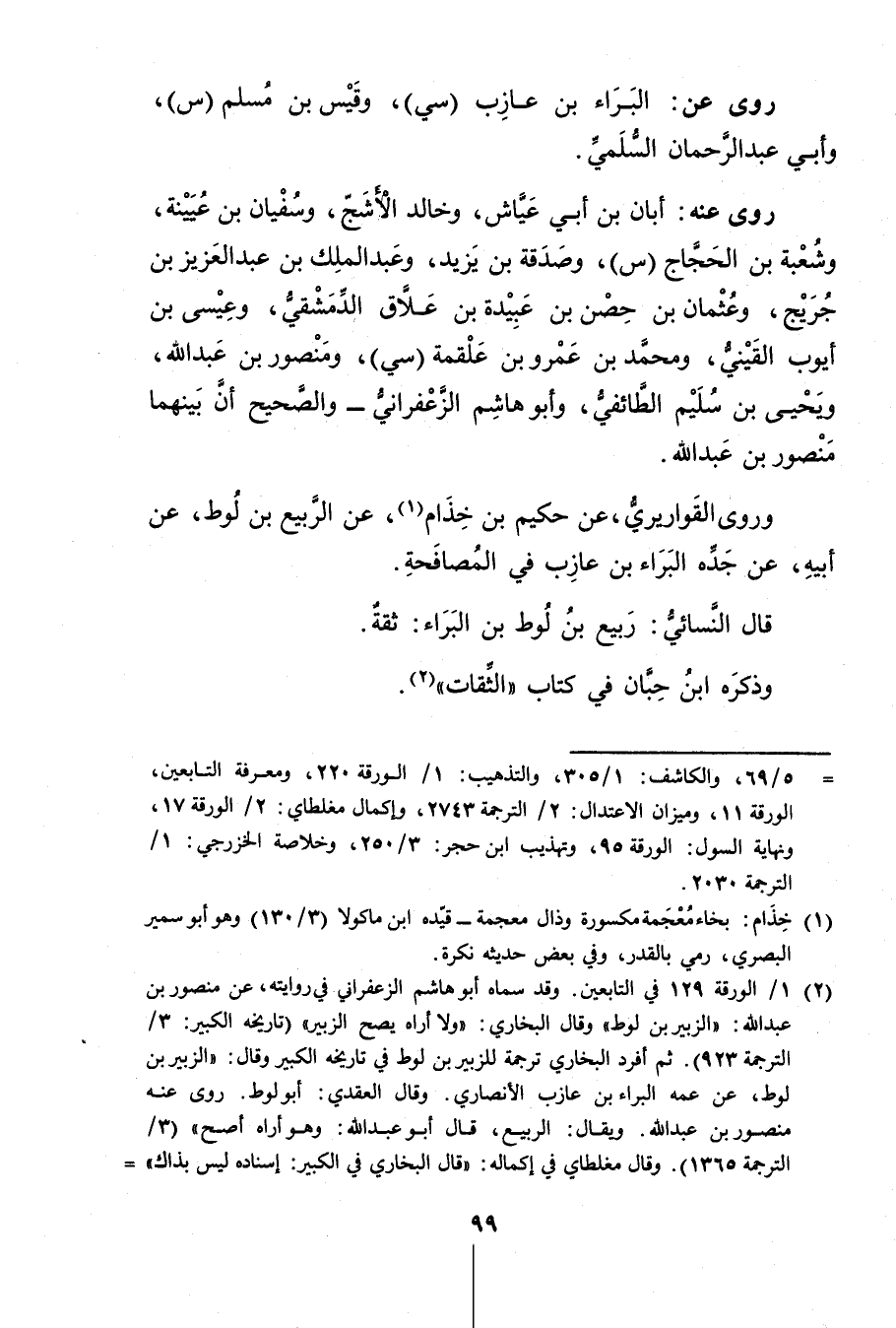 = 5 / 69، والكاشف: 1 / 305، والتذهيب: 1 / الورقة 220، ومعرفة التابعين، الورقة 11، وميزان الاعتدال: 2 / الترجمة 2743، وإكمال مغلطاي: 2 / الورقة 17، ونهاية السول: الورقة 95، وتهذيب ابن حجر: 3 / 250، وخلاصة الخزرجي: 1 / الترجمة 2030.