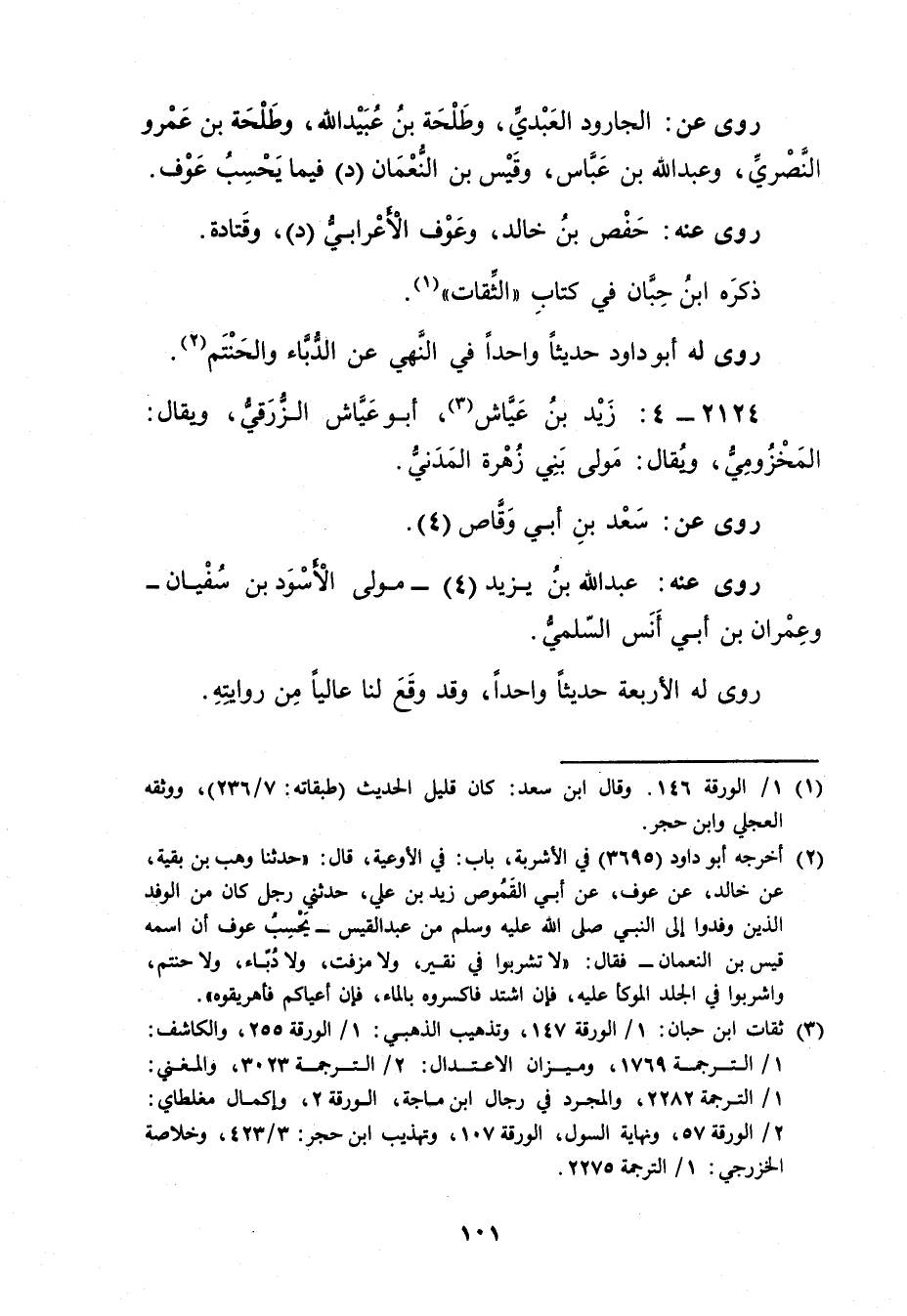 (2) أخرجه أبو داود (3695) في الاشربة، باب: في الاوعية، قال: حَدَّثَنَا وهْبُ بْنُ بَقِيَّةَ، عن خالد، عن عوف، عَن أبي القموص زيد بن علي، حَدَّثَنِي رجل كَانَ من الوفد الذين وفَدُوا إِلَى النَّبِيِّ صَلَّى اللَّهُ عليه وسلم من عبد القيس - يحسب عوف أن اسمه قَيْس بن النعمان - فقال: لا تشربوا في نقير، ولا مزفت، ولا دباء، ولا حنتم، واشربوا في الجلد الموكأ عليه، فإن اشتد فاكسروه بالماء، فإن أعياكم فأهريقوه" (3) ثقات ابن حبان: 1 / الورقة 147، وتذهيب الذهبي: 1 / الورقة 255، والكاشف: 1 / الترجمة 1769، وميزان الاعتدال: 2 / الترجمة 3023، والمغني: 1 / الترجمة 2282، والمجرد في رجال ابن ماجة، الورقة 2، وإكمال مغلطاي: 2 / الورقة 57، ونهاية السول، الورقة 107، وتهذيب ابن حجر: 3 / 423، وخلاصة الخزرجي: 1 / الترجمة 2275.
