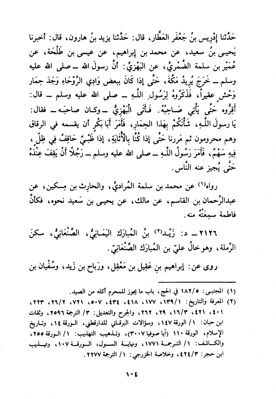 حَدَّثَنَا إِدْرِيسُ بْنُ جَعْفَرٍ الْعَطَّارُ، قال: حَدَّثَنَا يَزِيدُ بْنُ هَارُونَ، قال: أَخْبَرَنَا يَحْيَى بْنُ سَعِيد، عَنْ مُحَمَّدِ بْنِ إِبْرَاهِيمَ، عَنْ عِيسَى بْن طَلْحَة، عَنْ عُمَير بْن سَلَمَة الضمري، عَنِ البهزي: أن رَسُول اللَّهِ صَلَّى اللَّهُ عَلَيْهِ وسَلَّمَ خَرَجَ يُرِيدُ مَكَّةَ، حَتَّى إِذَا كَانَ بِبَعْضِ وادِي الرَّوْحَاءِ وجَدَ حِمَارَ وحْشٍ عَقِيرًا، فَذَكَرُوهُ لِرَسُولِ اللَّهِ صَلَّى اللَّهُ عَلَيْهِ وسَلَّمَ قال: أَقِرُّوهُ حَتَّى يَأْتِيَ صَاحِبَهُ. فَأَتَى الْبَهْزِيُّ - وكَانَ صَاحِبَهُ - فَقَالَ: يَا رَسُولَ اللَّهِ، شَأْنَكُمْ بِهَذَا الْحِمَارِ، فَأَمَرَ أَبَا بكر أن يقسمه في الرقاق وهم محرومون ثُمَّ مَرَرْنَا حَتَّى إِذَا كُنَّا بِالأُثَايَةِ، إِذَا ظَبْيٌ حَاقِفٌ فِي ظِلٍّ، فِيهِ سَهْمٌ، فَأَمَرَ رَسُولُ اللَّهِ صلى الله عليه وسلم رَجُلا أَنْ يَقِفَ عِنْدَهَ حَتَّى يُجِيزَ عَنْهُ النَّاسَ.