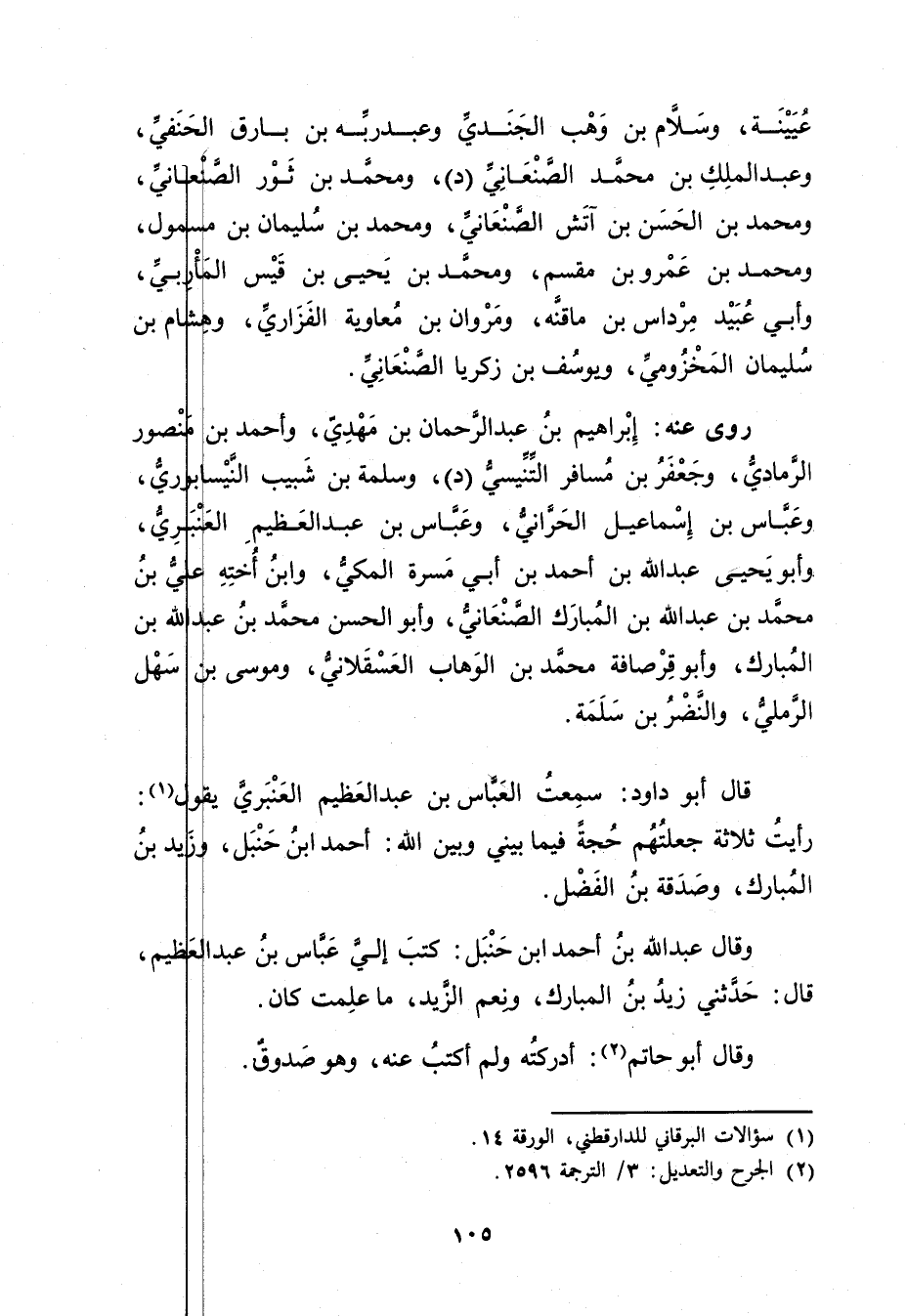 قال أَبُو دَاوُد: سمعت الْعَبَّاس بْن عبد العظيم العنبري يَقُول (1) : رأيت ثلاثة جعلتهم حجة فيما بيني وبين الله: أَحْمَد بْن حَنْبَل، وزيد بْن الْمُبَارَك، وصدقة بْن الْفَضْل.