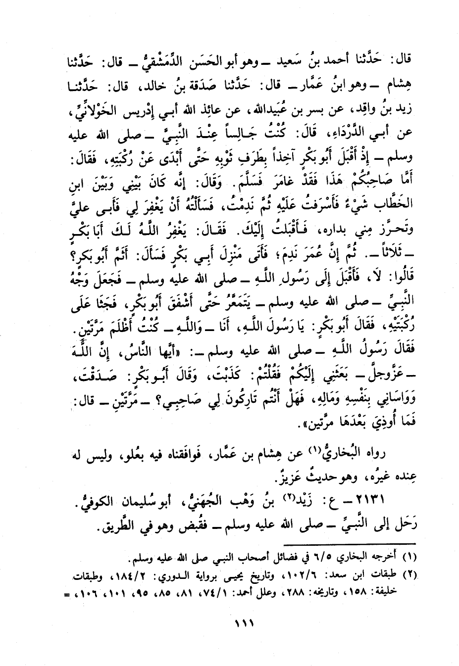 قال: حَدَّثَنَا أَحْمَدُ بْنُ سَعِيد - وهُوَ أَبُو الْحَسَنِ الدِّمَشْقِيُّ، قال: حَدَّثَنَا هِشَامٌ - وهُوَ ابْنُ عَمَّارٍ، قال: حَدَّثَنَا صَدَقَةُ بْنُ خَالِدٍ، قال: حَدَّثَنَا زَيْدُ بْنُ واقِدٍ، عَنْ بُسْرِ بْنِ عُبَيد اللَّهِ، عن عَائِذِ اللَّهِ أَبِي إِدْرِيسَ الْخَوْلانِيِّ، عَن أَبِي الدَّرْدَاءِ، قال: كُنْتُ جَالِسًا عِنْدَ النَّبِيِّ صَلَّى اللَّهُ عَلَيْهِ وسَلَّمَ إِذْ أَقْبَلَ أَبُو بَكْرٍ آخِذًا بِطَرْفِ ثَوْبِهِ حَتَّى أَبْدَى عَنْ رُكْبَتِهِ، فَقَالَ: أَمَّا صَاحِبُكُمْ هَذَا فَقَدْ غَامَرَ فَسَلِمَ. وَقَال: إِنَّهُ كَانَ بَيْنِي وبَيْنَ ابْنِ الْخَطَّابِ شَيْءٌ فَأَسْرَفْتُ عَلَيْهِ ثُمَّ نَدِمْتُ، فَسَأَلْتُهُ أَنْ يَغْفِرَ لِي فَأَبَى عَلَيَّ وتَحَرَّزَ مِنِّي بِدَارِهِ، فَأَقْبَلْتُ إِلَيْكَ.