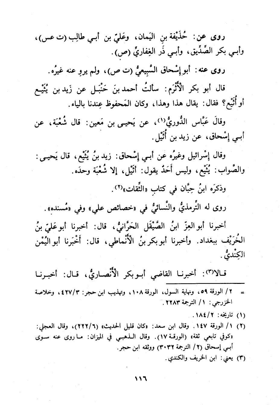 (2) 1 / الورقة 147. وَقَال ابن سعد: كَانَ قليل الحديث" (6 / 222) ، وَقَال العجلي: "كوفي تابعي ثقة" (الورقة 17) . وَقَال الذهبي في الميزان: ما روى عنه سوى أبي إسحاق (2 / الترجمة 3032) ووثقه ابن حجر.