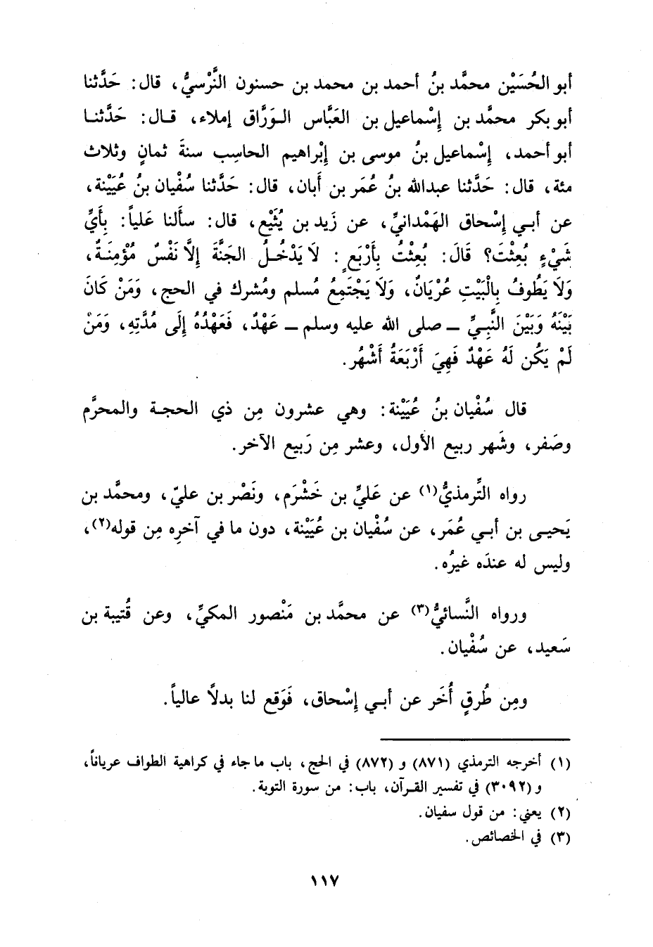 أَبُو الْحُسَيْنِ مُحَمَّدُ بْنُ أَحْمَدَ بن مُحَمَّد بن حسنون النرسي، قال: حَدَّثَنَا أَبُو بَكْر مُحَمَّد بْن إسماعيل بْن العباس الوراق إِمْلاءً، قال: حَدَّثَنَا أَبُو أَحْمَدَ، إِسْمَاعِيلُ بْنُ مُوسَى بْنِ إِبْرَاهِيمَ الحاسب سنة ثمان وثلاث مئة، قال: حَدَّثَنَا عَبد اللَّهِ بْن عُمَر بْنِ أَبَانٍ، قال: حَدَّثَنَا سفيان بْن عُيَيْنَة، عَن أبي إِسْحَاقَ الْهَمْدَانِيِّ، عَنْ زَيْدِ بْنِ يُثَيْعٍ، قال: سَأَلْنَا عَلِيًّا: بِأَيِّ شَيْءٍ بُعِثْتَ؟ قال: بُعِثْتُ بِأَرْبَعٍ: لا يَدْخُلُ الْجَنَّةَ إِلا نَفْسٌ مُؤْمِنَةٌ، ولا يَطُوفُ بِالْبَيْتِ عُرْيَانُ، ولا يَجْتَمِعُ مُسْلِمُ ومُشْرِكٌ فِي الْحَجِّ، ومَنْ كَانَ بَيْنَهُ وبَيْنَ النَّبِيُّ صلى الله عليه وسلم عَهْدٌ، فَعَهْدُهُ إِلَى مُدَّتِهِ، ومَنْ لَمْ يَكُنْ لَهُ عَهْدٌ فَهِيَ أَرْبَعَةُ أَشْهُرٍ.