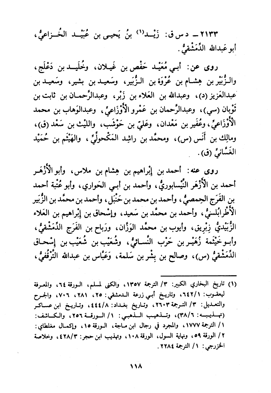 2133 - د س ق: زيد بن يَحْيَى بن عُبَيد الْخُزَاعِيّ (1) ، أبو عَبْد اللَّهِ الدِّمَشْقِيّ.