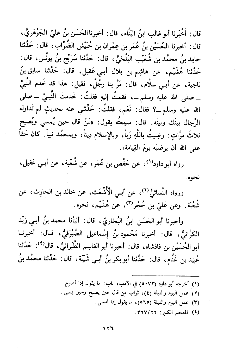 قال: سَمِعْتُهُ يَقُولُ: مَنْ قال حِينَ يُمْسِي ويُصْبِحُ ثَلاثَ مَرَّاتٍ: رَضِيتُ بِاللَّهِ رَبًّا، وبِالإِسْلامِ دِينًا، وبِمُحَمَّدٍ نَبِيًّا. كَانَ حَقًّا عَلَى اللَّهِ أَنْ يُرْضِيَهُ يَوْمَ الْقِيَامَةِ.