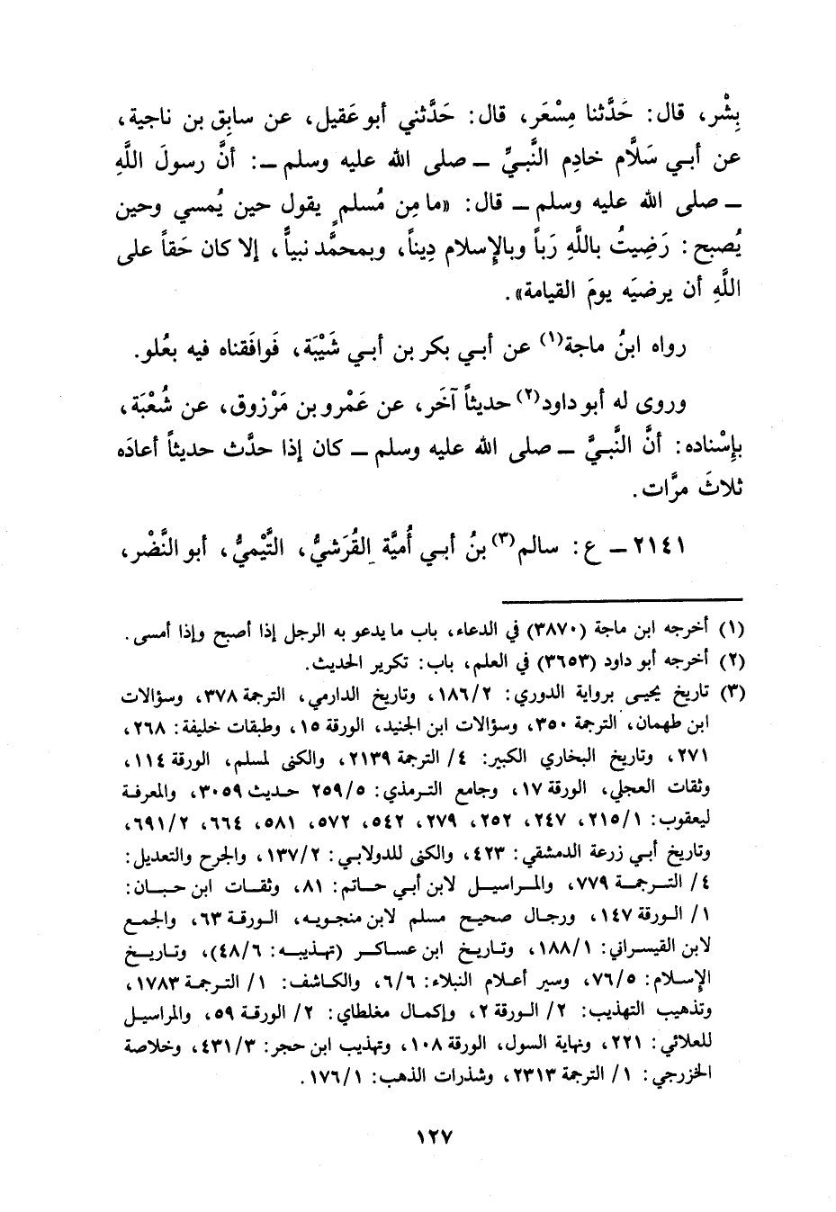 بِشْرٍ، قال: حَدَّثَنَا مِسْعَرٌ، قال: حَدَّثَنِي أَبُو عُقَيْلٍ، عَنْ سَابِقِ بْنُ نَاجِيَةَ، عَن أَبِي سَلامٍ خادم النَّبِيّ صَلَّى اللَّهُ عَلَيْهِ وسلم: أَنَّ رَسُولَ اللَّهِ صلى اللَّهُ عَلَيْهِ وسَلَّمَ قال: ما مِنْ مُسْلِمٍ يَقُولُ حِينَ يُمْسِي وحِينَ يُصْبِحُ: رَضِيتُ بِاللَّهِ رَبًّا وبِالإِسْلامِ دِينًا، وبِمُحَمَّدٍ نَبِيًّا، إِلا كَانَ حَقًّا عَلَى