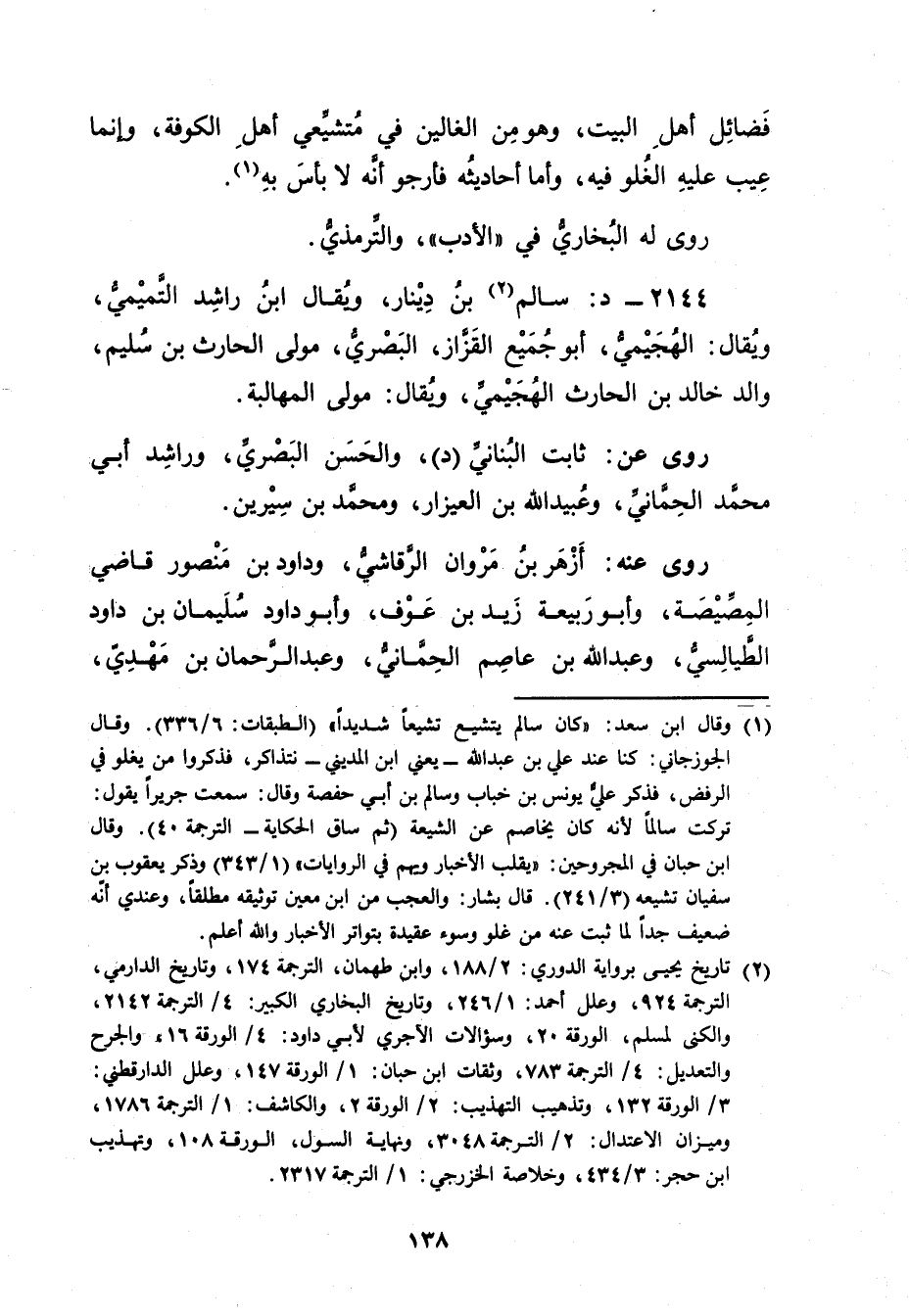 2144 - د: سَالِم بن دِينَار (2) ، ويُقال ابْن راشد التَّمِيمِيّ، ويُقال: الهجيمي، أَبُو جميع القزاز، البَصْرِيّ، مولى الْحَارِث بْن سليم، والد خَالِد بْن الْحَارِث الهجيمي، ويُقال: مولى المهالبة.