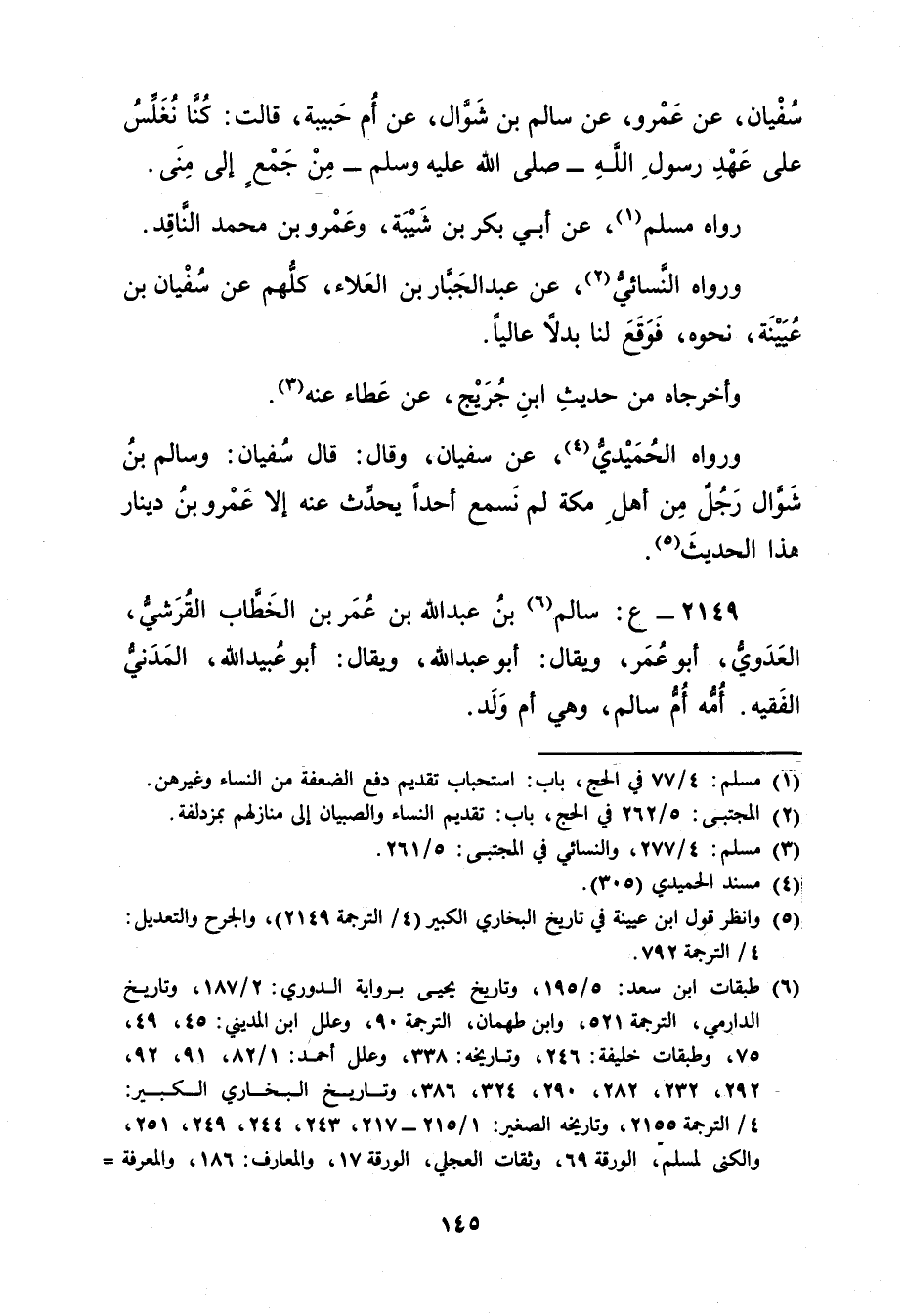 2149 - ع: سَالِم بن عَبد اللَّهِ بن عُمَر بن الخطاب القرشي (6) ، العدوي، أَبُو عُمَر، ويُقال: أَبُو عَبْد اللَّهِ، ويُقال: أَبُو عُبَيد الله، الْمَدَنِيّ الفقيه. أمه أم سالم، وهي أم ولد.
