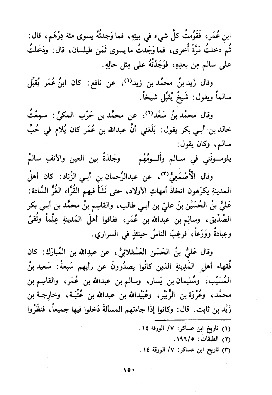وَقَال علي بْن الْحَسَن الْعَسْقَلانِيّ، عن عَبد الله بْن المبارك: كَانَ فقهاء أهل الْمَدِينَة الذين كانوا يصدرون عَنْ رأيهم سبعة: سَعِيد بْن المُسَيَّب، وسُلَيْمان بْن يسار، وسالم بْن عَبد اللَّهِ بْن عُمَر، والقاسم بْن مُحَمَّد، وعروة بْن الزبير، وعُبَيد اللَّه بْن عَبد الله بْن عتبة، وخارجة بْن زيد بْن ثابت.