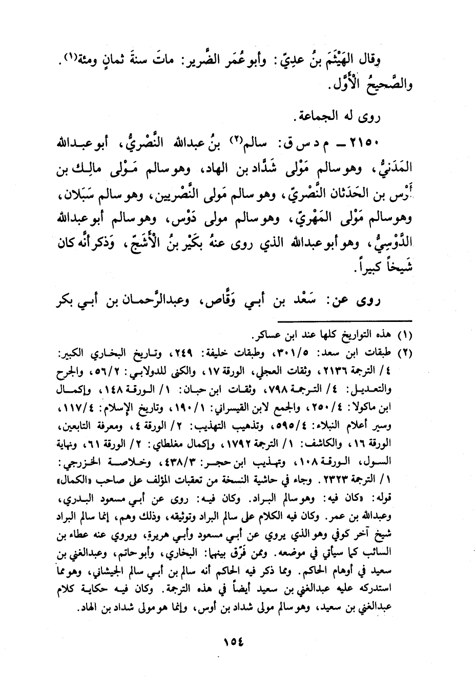(2) طبقات ابن سعد: 5 / 301، وطبقات خليفة: 249، وتاريخ البخاري الكبير: 4 / الترجمة 2136، وثقات العجلي، الورقة 17، والكنى للدولابي: 2 / 56، والجرح والتعديل: 4 / الترجمة 798، وثقات ابن حبان: 1 / الورقة 148، وإكمال ابن ماكولا: 4 / 250، والجمع لابن القيسراني: 1 / 190، وتاريخ الاسلام: 4 / 117، وسير أعلام النبلاء: 4 / 595، وتذهيب التهذيب: 2 / الورقة 4، ومعرفة التابعين، الورقة 16، والكاشف: 1 / الترجمة 1792، وإكمال مغلطاي: 2 / الورقة 61، ونهاية السول، الورقة 108، وتهذيب ابن حجر: 3 / 438، وخلاصة الخزرجي: 1 / الترجمة 2323. وجاء في حاشية النسخة من تعقبات المؤلف على صاحب "الكمال" قوله: كان فيه: وهو سالم البراد. وكان فيه: روى عَن أبي مسعود البدري، وعبد الله بن عُمَر.