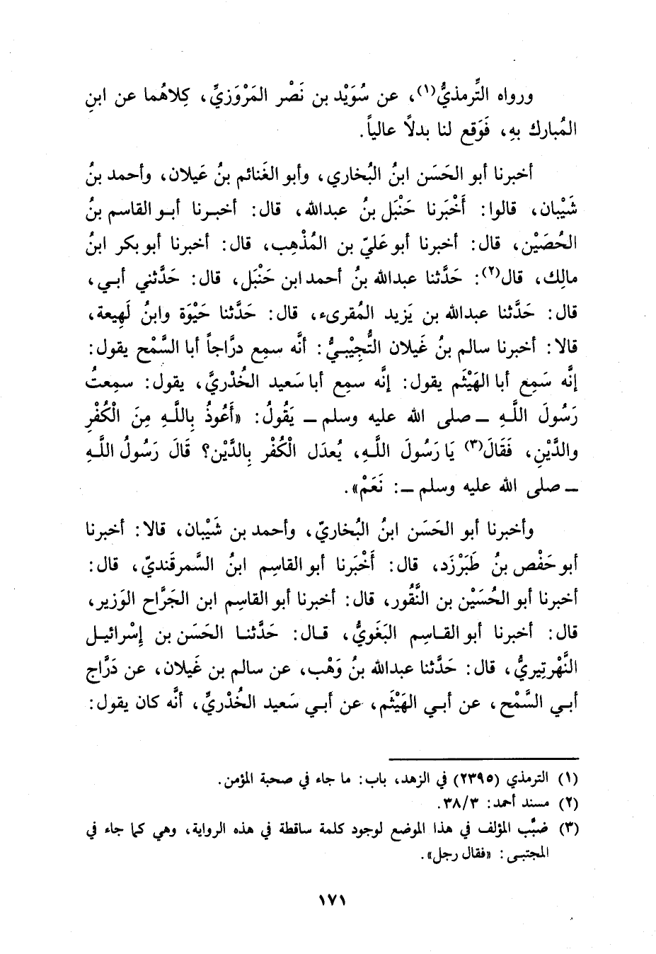 أَخْبَرَنَا أَبُو الْحَسَنِ بْنُ البخاري، وأبو الغنائم بن عيلان، وأَحْمَدُ بْنُ شَيْبَانَ، قَالُوا: أَخْبَرَنَا حنبل بْن عَبد الله، قال: أَخْبَرَنَا أبو القاسم بْن الحصين، قال: أَخْبَرَنَا أَبُو علي بْن المذهب، قال: أَخْبَرَنَا أبو بكر بْن مالك، قال (2) : حَدَّثَنَا عَبد اللَّهِ بْن أَحْمَد بْن حنبل، قال: حَدَّثني أبي، قال: حَدَّثَنَا عَبد اللَّهِ بْن يزيد المقرئ، قال: حَدَّثَنَا حَيْوَةُ وابْنُ لَهِيعَة، قَالا: أَخْبَرَنَا سَالِم بْن غَيْلان التجيبي: أنه سمع دراجا أبا السمح يَقُول: إنه سمع أبا الْهَيْثَم يَقُول: إنه سمع أبا سَعِيد الخُدْرِيّ، يَقُول: سمعت رَسُول اللَّهِ صلى الله عليه وسلم يَقُول: أعوذ بالله من الكفر والدين، فَقَالَ (3) يَا رَسُول اللَّهِ، يعدل الكفر بالدين؟ قال رَسُول اللَّهِ صلى الله عليه وسلم: نعم.