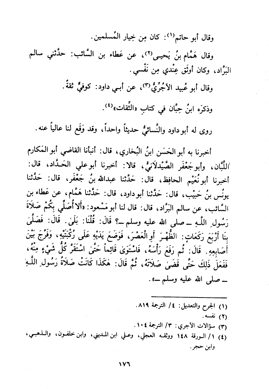 أخبرنا بِهِ أَبُو الْحَسَنِ بْنُ الْبُخَارِيِّ، قال: أَنْبَأَنَا الْقَاضِي أَبُو الْمَكَارِمِ اللَّبَّانُ، وأَبُو جَعْفَرٍ الصَّيْدَلانِيُّ، قالا: أَخْبَرَنَا أَبُو علي الحداد، قال: أَخْبَرَنَا أَبُو نُعَيْمٍ الْحَافِظُ، قال: حَدَّثَنَا عَبد اللَّهِ بْن جَعْفَرٍ، قال: حَدَّثَنَا يُونُسُ بْنُ حَبِيبٍ، قال: حَدَّثَنَا أَبُو دَاوُدَ، قال: حَدَّثَنَا هَمَّامٌ، عَنْ عَطَاءِ بْنِ السَّائِبِ، عَنْ سَالِمٍ الْبَرَّادِ، قال: قال لَنَا أَبُو مَسْعُودٍ: أَلا أُصَلِّي بِكُمْ صَلاةَ رَسُولِ اللَّهِ صلى الله عليه وسلم؟ قال: قُلْنَا: بَلَى. قال: فَصَلَّى بِنَا أَرْبَعَ رَكَعَاتِ: الظُّهْرِ أَوِ الْعَصْرِ، فَوَضَعَ يَدَيْهِ عَلَى رُكْبَتَيْهِ، وفَرَّجَ بَيْنَ أَصَابِعِهِ. قال: ثُمَّ رَفَعَ رَأْسَهُ، فَاسْتَوَى قَائِمًا حَتَّى اسْتَقَرَّ كُلُّ شَيْءٍ مِنْهُ، فَفَعَلَ ذَلِكَ حَتَّى قَضَى صَلاتَهُ، ثُمَّ قال: هَكَذَا كَانَتْ صَلاةُ رَسُولِ اللَّهِ صلى الله عليه وسلم.