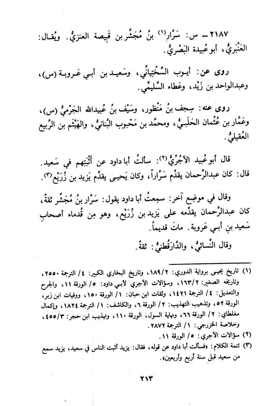 2187 - س: سرار بن مجشر بن قبيصة العنزي (1) . ويُقال: العنبري، أَبُو عُبَيدة البَصْرِيّ.