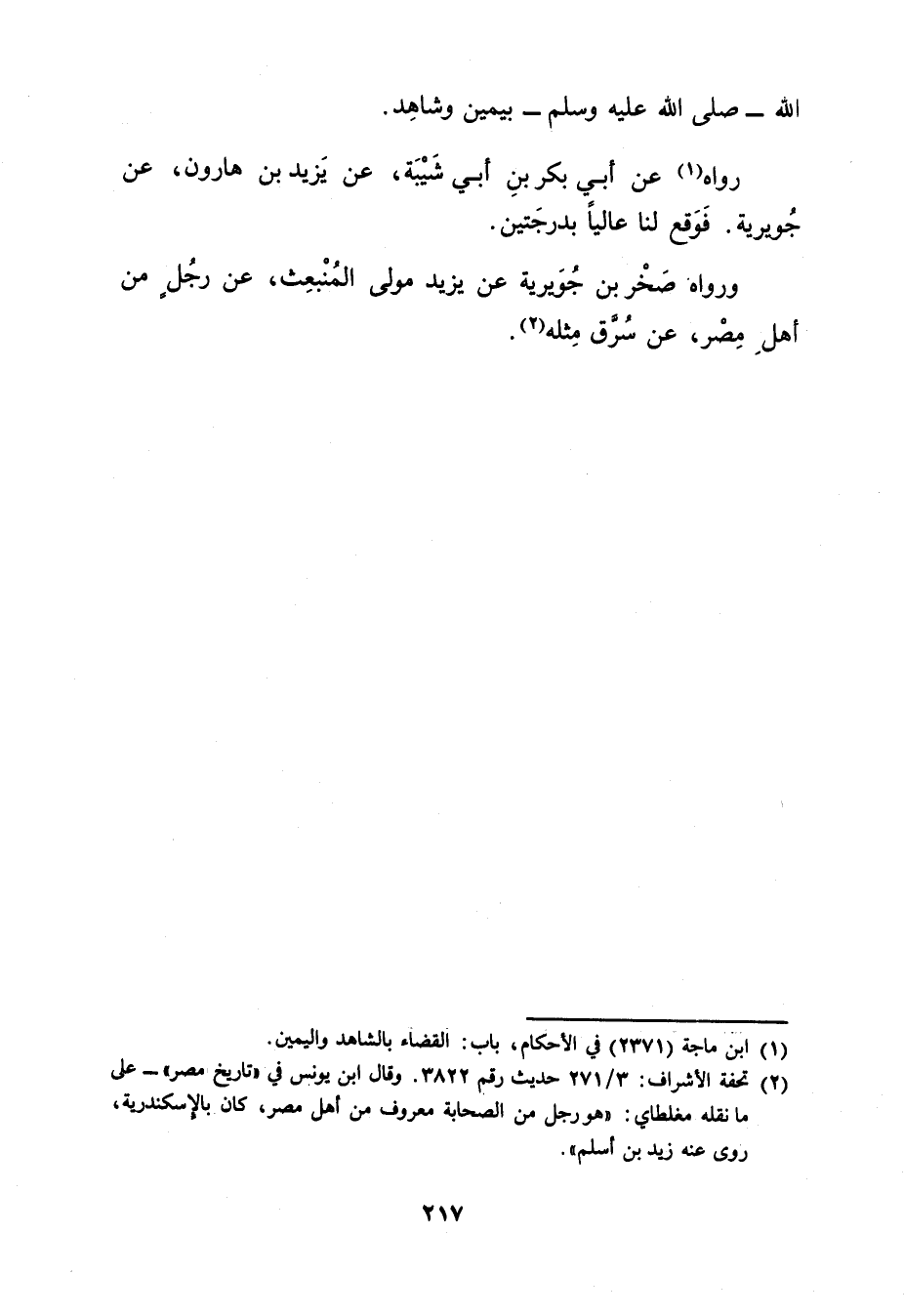 رواه (1) عَن أَبِي بَكْرِ بْنِ أَبي شَيْبَة، عن يَزِيد بْن هَارُون، عَنْ جويرية. فَوَقَعَ لَنَا عَالِيًا بِدَرَجَتَيْنِ.