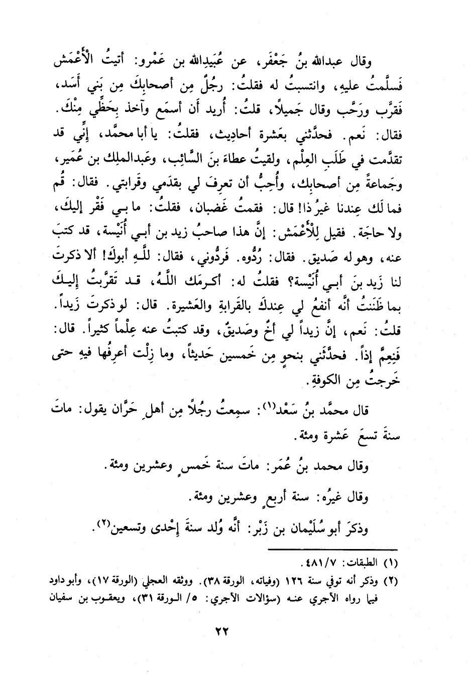 (2) وذكر أنه توفي سنة 126 (وفياته، الورقة 38) . ووثقه العجلي (الورقة 17) ، وأبو داود فيما رواه الآجري عنه (سؤالات الآجري: 5 / الورقة 31) ، ويعقوب بن سفيان