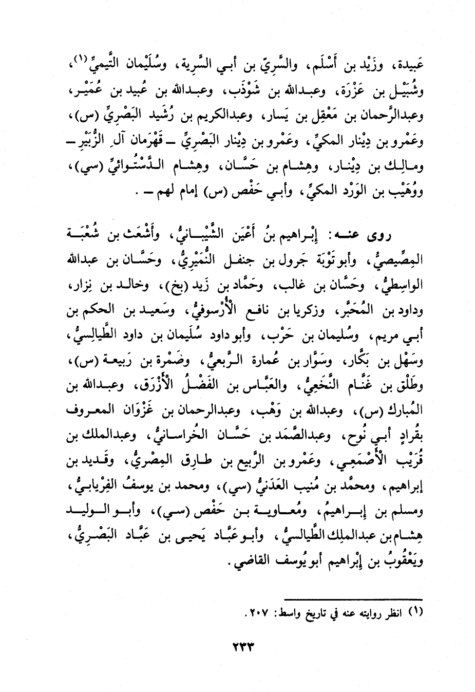 عُبَيدة، وزيد بْن أسلم، والسري بْن أَبي السرية، وسُلَيْمان التَّيْمِيّ (1) ، وشبيل بْن عزرة، وعبد الله بْن شوذب، وعبد الله بْن عُبَيد بْن عُمَير، وعبد الرحمن بْن معقل بْن يسار، وعبد الكريم بْن رشيد البَصْرِيّ (س) ، وعَمْرو بْن دينار المكي، وعَمْرو بن دينار البَصْرِيّ - قهرمان آل الزُّبَيْر - ومالك بْن دِينَار، وهشام بْن حسان، وهشام الدستوائي (سي) ، ووهيب بْن الورد المكي، وأَبِي حَفْص (س) إمام لهم -.