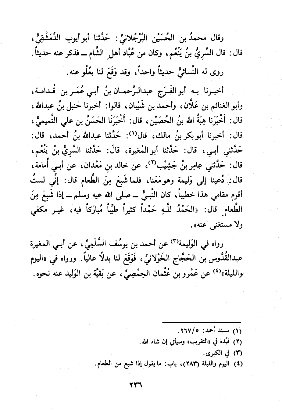 أَخْبَرَنَا به أَبُو الفرج عَبْدُ الرَّحْمَنِ بْنُ أَبي عُمَر بْنُ قُدَامَةَ، وأَبُو الْغَنَائِمِ بْنُ عَلانَ، وأَحْمَدُ بْنُ شَيْبَانَ، قَالُوا: أَخْبَرَنَا حنبل بْن عَبد الله، قال: أَخْبَرَنَا هِبَةُ اللَّهِ بْنُ الحصين، قال: أَخْبَرَنَا الحسن بْن عَلِيٍّ التَّمِيمِيُّ، قال: أَخْبَرَنَا أَبُو بكر بْن مالك، قال (1) : حَدَّثَنَا عَبد اللَّهِ بْن أَحْمَدَ، قال: حَدَّثني أبي، قال: حَدَّثَنَا أَبُو الْمُغِيرَةِ، قال: حَدَّثَنَا السَّرِيُّ بْنُ يَنْعُمَ، قال: حَدَّثَنِي عَامِرُ بْنُ جَشِيبٍ (2) ، عَنْ خَالِدِ بْنِ مَعْدَانَ، عَن أَبِي أُمَامَةَ، قال: دُعِينَا إِلَى ولِيمَةٍ وهُوَ مَعَنَا، فَلَمَّا شَبِعَ مِنَ الطَّعَامِ قال: إِنِّي لَسْتُ أَقُومُ مَقَامِي هَذَا خَطِيبًا، كَانَ النَّبِيّ صلى الله عليه وسَلَّمَ إِذَا شَبِعَ مِنَ الطَّعَامِ قال: الْحَمْدُ لِلَّهِ حَمْدًا كَثِيرًا طَيِّبًا مُبَارَكًا فِيهِ، غَيْرُ مَكْفِيٍّ ولا مُسْتَغْنًى عَنْهُ.