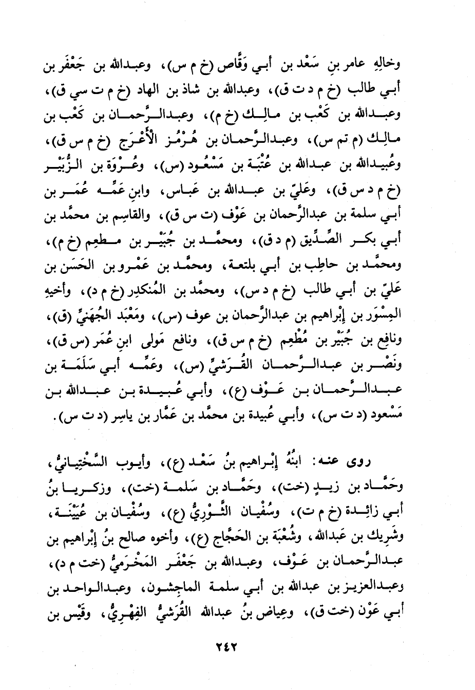 وخاله عَامِر بْن سَعْد بْن أَبي وقاص (خ م س) ، وعبد الله بْن جَعْفَر بْن أَبي طالب (خ م د ت ق) ، وعبد الله بْن شاذ بْن الهاد (خ م ت سي ق) ، وعَبْد اللَّهِ بْن كعب بْن مالك (خ م) ، وعبد الرحمن بْن كعب بْن مَالِك (م تم س) ، وعبد الرحمن بْن هرمز الأعرج (خ م س ق) ، وعُبَيد الله بْن عَبد الله بْن عتبة بْن مَسْعُود (س) ، وعروة بْن الزبير (خ م د س ق) ، وعلي بن عَبد اللَّهِ بْن عَبَّاس، وابن عمه عُمَر بْن أَبي سَلَمَة بْن عَبْد الرحمن بْن عوف (ت س ق) ، والقاسم بْن مُحَمَّدِ بْن أَبي بكر الصديق (م د ق) ، ومحمد بْن جبير بْن مطعم (خ م) ، ومحمد بْن حَاطِب بْن أَبي بلتعة، ومحمد بْن عَمْرو بْن الْحَسَن بْن علي بْن أَبي طالب (خ م د س) ، ومحمد بْن المنكدر (خ م د) ، وأخيه المسور بْن إِبْرَاهِيم بْن عَبْد الرَّحْمَنِ بْن عوف (س) ، ومعبد الْجُهَنِيّ (ق) ، ونافع بْن جبير بْن مطعم (خ م س ق) ، ونافع مولى ابْن عُمَر (س ق) ، ونصر بْن عَبْد الرَّحْمَنِ الْقُرَشِيّ (س) ، وعمه أبي سلمة بْن عَبْد الرحمن بْن عوف (ع) ، وأَبِي عُبَيدة بْن عَبد الله بْن مسعود (د ت س) ، وأَبِي عُبَيدة بْن مُحَمَّد بْن عمار بْن ياسر (د ت س) .