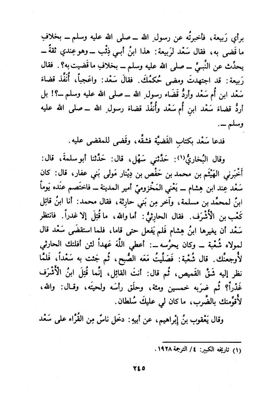 وقَال البُخارِيُّ (1) : حَدَّثَنِي سهل، قال: حَدَّثَنَا أَبُو سَلَمَةَ، قال: أَخْبَرَنِي الْهَيْثَم بْن مُحَمَّد بْن حَفْص بْن دِينَار مولى بني عفار، قال: كان سعد عند ابن هِشَام، يَعْنِي المخزومي أمير الْمَدِينَة - فاختصم عنده يوما ابْن لمحمد بْن مسلمة، وآخر من بني حَارِثَة، فَقَالَ مُحَمَّد: أنا ابْن قاتل كعب بْن الأشرف. فَقَالَ الحارثي: أما والله، ما قتل إلا غدرا. فانتظر سَعْد أن يغيرها ابن هِشَام فلم يفعل حَتَّى قاما، فلما استقضى سَعْد قال لمولاه شعبة - وكان يحرسه: أعطي الله عهدا لئن أفلتك الحارثي لأوجعنك.