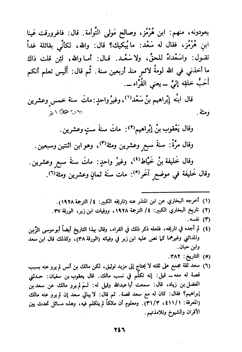 (6) سعد ثقة مجمع على ثقته لا يحتاج إلى مزيد توثيق، لكن مالك بن أنس لم يرو عنه بسبب قصة له معه - قيل: إنه تكلم في نسب مالك.