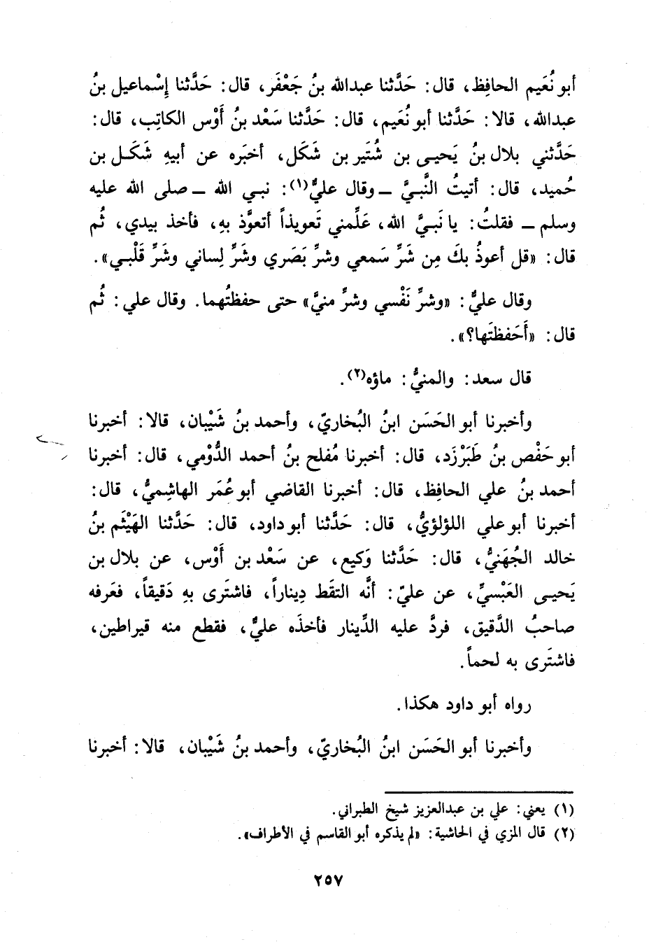 أَبُو نعيم الحافظ، قال: حَدَّثَنَا عَبد الله بْن جعفر، قال: حَدَّثَنَا إسماعيل بْن عَبد اللَّهِ، قَالا: حَدَّثَنَا أَبُو نُعَيْمٍ، قال: حَدَّثَنَا سَعْدُ بْنُ أَوْسٍ الْكَاتِبُ، قال: حَدَّثَنِي بِلالُ بْنُ يَحْيَى بْنِ شُتَيْرِ بْنِ شَكَلٍ، أُخْبِرَهُ عَن أَبِيهِ شَكَلِ بْنِ حُمَيْدٍ، قال: أَتَيْتُ النَّبِيَّ صَلَّى اللَّهُ عليه وسلم وَقَال عَلِيٌّ (1) : نَبِيَّ اللَّهِ صَلَّى اللَّهُ عليه وسلم فقلت: يا نَبِيَّ اللَّهِ، عَلِّمْنِي تَعْوِيذًا أَتَعَوَّذُ بِهِ، فَأَخَذَ بِيَدِي، ثُمَّ قال: قُلْ أَعُوذُ بِكَ مِنْ شَرِّ سَمْعِي وشَرِّ بَصَرِي وشَرِّ لِسَانِي وشَرِّ قَلْبِي.