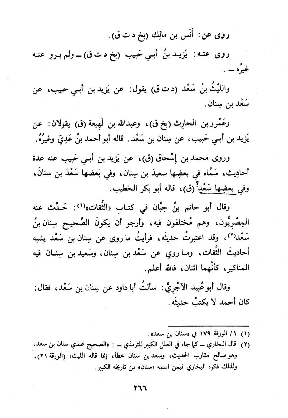 (2) قال البخاري - كما جاء في العلل الكبير للترمذي: الصحيح عندي سنان بن سعد، وهو صالح مقارب الحديث، وسعد بن سنان خطأ، إنما قاله الليث" (الورقة 21) ، ولذلك ذكره البخاري فيمن اسمه"سنان"من تاريخه الكبير.