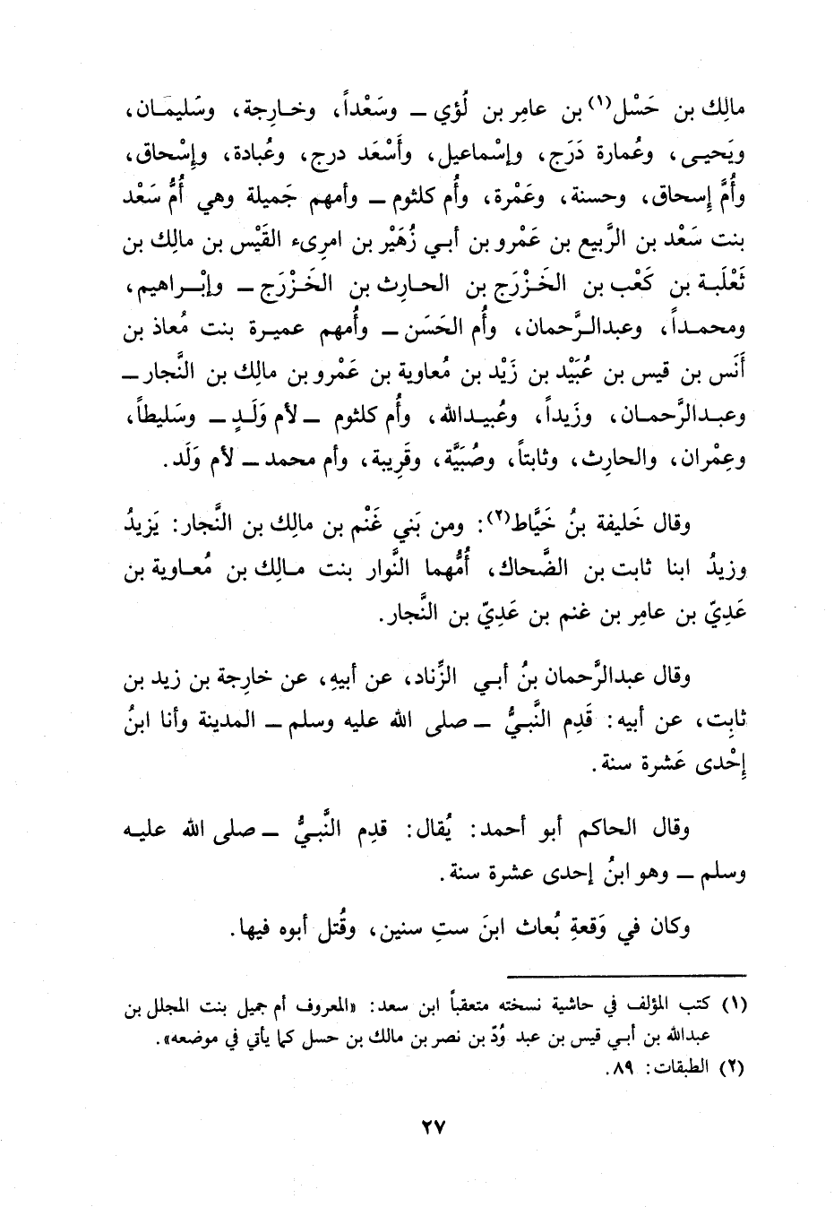 وَقَال خليفة بْن خياط (2) : ومن بني غنم بْن مَالِك بْن النجار: يَزِيد وزيد ابنا ثَابِت بْن الضحاك، أمهما النوار بِنْت مَالِك بْن معاوية بْن عدي بْن عَامِر بن غنم بن عدي بن النجار.