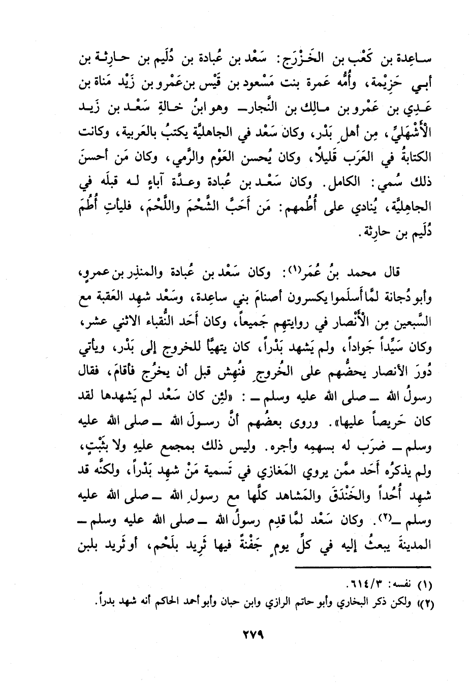 قال مُحَمَّد بْن عُمَر (1) : وكان سَعْد بْن عبادة والمنذر بْن عَمْرو، وأَبُو دجانة لما أسلموا يكسرون أصنام بني ساعدة، وسعد شهد العقبة مع السبعين من الأنصار فِي روايتهم جميعا، وكَانَ أحد النقباء الاثني عشر، وكان سيدا جوادا، ولم يشهد بدرا، كَانَ يتهيأ للخروج إِلَى بدر، ويأتي دور الأنصار يحضهم على الخروج فنهش قبل أن يخرج فأقام، فَقَالَ رَسُول اللَّهِ صلى الله عليه وسَلَّمَ: لئن كَانَ سَعْد لم يشهدها لقد كَانَ حريصا عليها". وروى بعضهم أن رَسُول اللَّهِ صَلَّى اللَّهُ عَلَيْه وسَلَّمَ ضَرَبَ لَهُ بسهمه وأجره. وليس ذَلِكَ بمجمع عليه ولا بثبت، ولم يذكره أحد ممن يروى المغازي فِي تسمية من شهد بدرا، ولكنه قد شهد أحدا والخندق والمشاهد كلها مع رَسُول اللَّهِ صَلَّى اللَّهُ عَلَيْهِ وسَلَّمَ (2) .