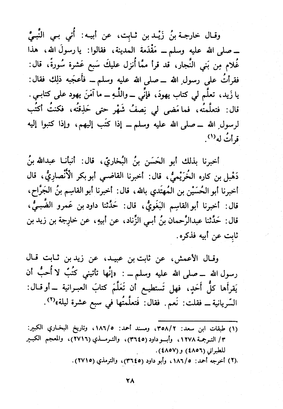 وَقَال خَارِجَةُ بْنُ زَيْدِ بْنِ ثَابِتٍ، عَن أَبِيهِ: أُتِيَ بِي النَّبِيُّ صلى الله عليه وسلم مَقْدَمَهُ الْمَدِينَةَ، فَقَالُوا: يَا رَسُولَ اللَّهِ، هَذَا غُلامٌ مِنْ بَنِي النَّجَّارِ، قَدْ قَرَأَ مِمَّا أُنْزِلَ عَلَيْكَ سَبْعَ عَشْرَةَ سُورَةً، قال: فَقَرَأْتُ عَلَى رَسُولِ اللَّهِ صَلَّى اللَّهُ عَلَيْهِ وسَلَّمَ فَأَعْجَبَهُ ذَلِكَ فَقَالَ: يَا زَيْدُ، تَعَلَّمْ لِي كِتَابَ يَهُودَ، فَإِنِّي - واللَّهِ - مَا آمَنُ يَهُودَ عَلَى كِتَابِي. قال: فَتَعَلَّمْتُهُ، فَمَا مَضَى لِي نِصْفُ شَهْرٍ حَتَّى حَذَقْتَهُ، فَكُنْتُ أَكْتُبُ لِرَسُولِ اللَّهِ صَلَّى اللَّهُ عَلَيْهِ وسَلَّمَ إِذَا كَتَبَ إِلَيْهِمْ، وإِذَا كَتَبُوا إِلَيْهِ قَرَأْتُ لَهُ (1) .