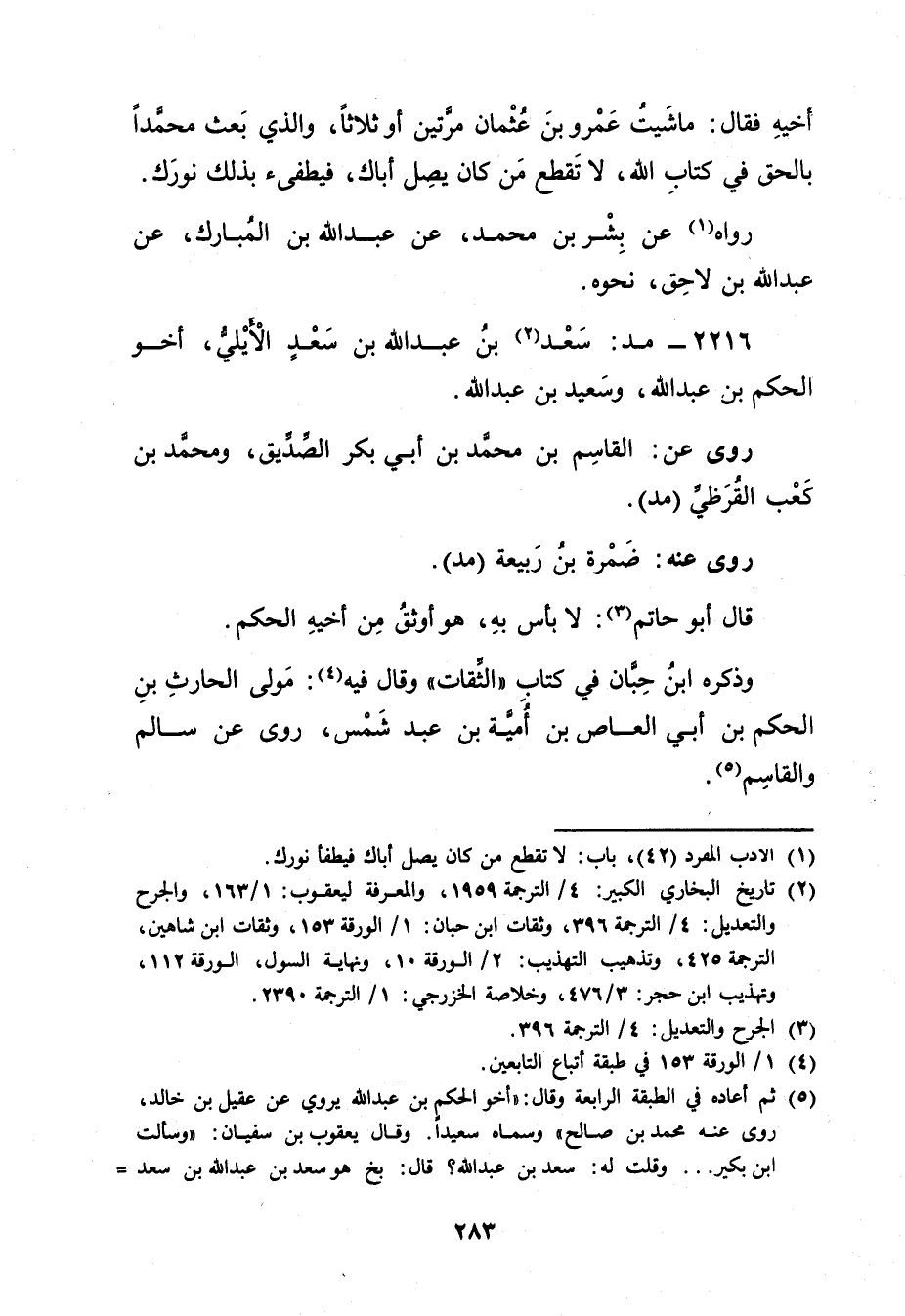 وذكره ابنُ حِبَّان فِي كتاب "الثقات" وَقَال فيه (4) : مولى الْحَارِث بْن الْحَكَمِ بْن أَبي العاص بن أمية بن عَبْد شمس، روى عن سَالِم والقاسم (5) .