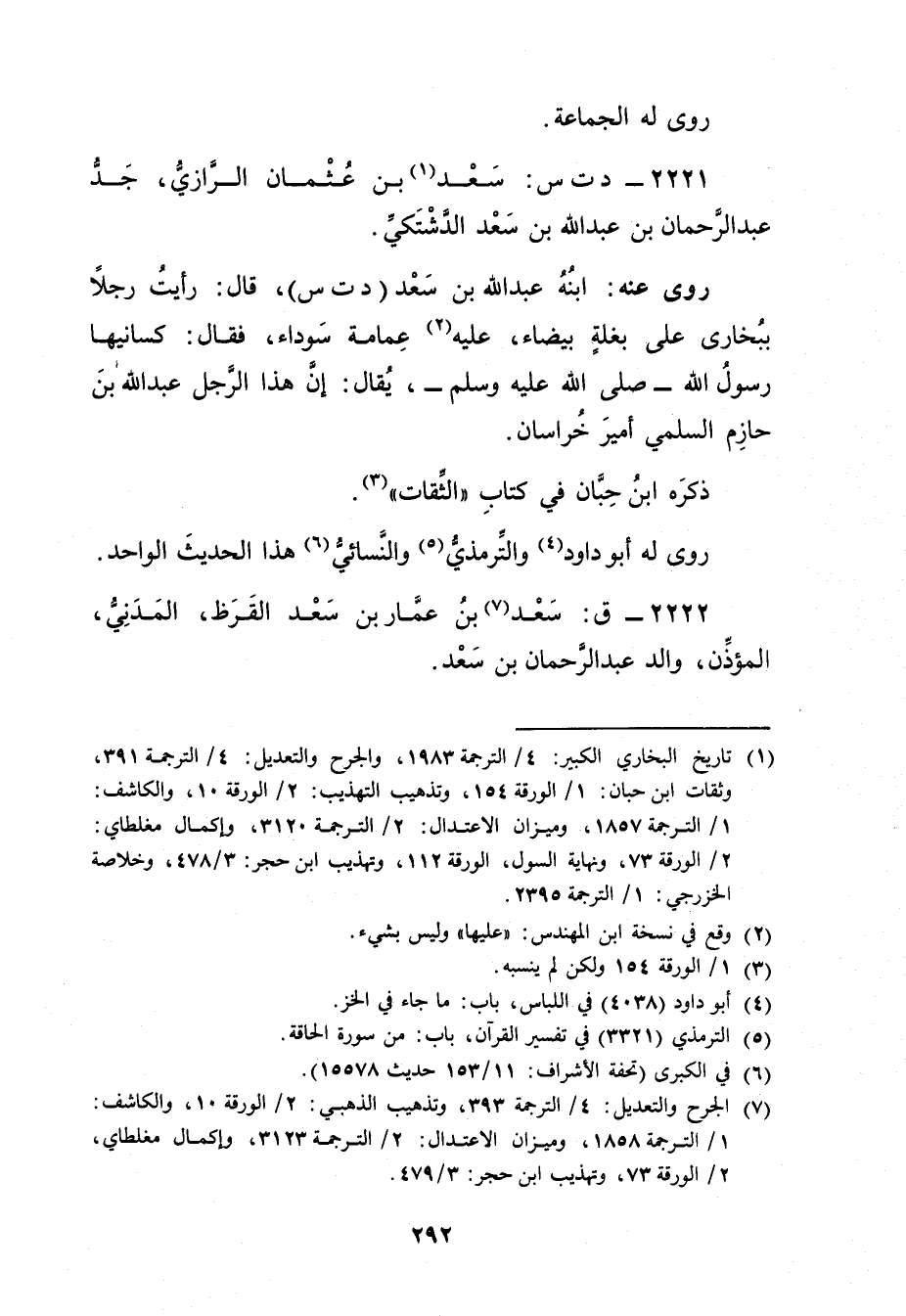 2221 - د ت س: سَعْد بن عُثْمَان الرازي (1) ، جد عَبْد الرَّحْمَنِ بْن عَبد اللَّهِ بْن سَعْد الدشتكي.