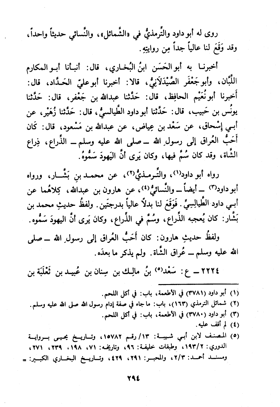 أخبرنا به أَبُو الْحَسَنِ بْنِ الْبُخَارِيِّ، قال: أنبأنا أَبُو الْمَكَارِمِ اللَّبَّانُ، وأَبُو جَعْفَرٍ الصَّيْدَلانِيُّ، قالا: أَخْبَرَنَا أَبُو علي الحداد، قال: أَخْبَرَنَا أَبُو نُعَيْمٍ الْحَافِظُ، قال: حَدَّثَنَا عَبد اللَّهِ بْن جَعْفَرٍ، قال: حَدَّثَنَا يُونُسُ بْنُ حَبِيبٍ، قال: حَدَّثَنَا أَبُو دَاوُدَ الطَّيَالِسِيُّ، قال: حَدَّثَنَا زُهَيْرٌ، عَن أَبِي إِسْحَاقَ، عَنْ سَعْدِ بْنِ عِيَاضٍ، عَنْ عَبد اللَّهِ بْنِ مَسْعُودٍ، قال: كَانَ أَحَبُّ الْعُرَاقِ إِلَى رَسُولِ اللَّهِ صَلَّى اللَّهُ عَلَيْهِ وسَلَّمَ الذِّرَاعَ، ذِرَاعَ الشَّاةِ، وقَدْ كَانَ سُمٌّ فِيهَا، وكَانَ يَرَى أَنَّ الْيَهُودَ سَمُّوهُ.