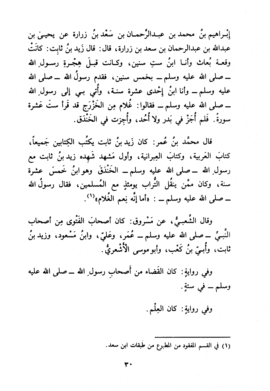 إِبْرَاهِيم بن مُحَمَّد بن عَبْد الرحمن بْن سعد بْن زرارة عن يَحْيَى بْنِ عَبد اللَّهِ بْن عَبْد الرحمن بْن سعد بْنِ زُرَارَةَ، قال: قال زَيْدُ بْنُ ثَابِتٍ: كَانَتْ وقْعَةُ بِعَاثٍ وأَنا ابْنُ سِتِّ سِنِينَ، وكَانَتْ قَبْلَ هِجْرَةِ رَسُولِ اللَّهِ صَلَّى اللَّهُ عَلَيْهِ وسَلَّمَ بخمس سنين، فَقَدِمَ رَسُولُ اللَّهِ صَلَّى اللَّهُ عَلَيْهِ وسَلَّمَ وأَنَا ابْنُ إِحْدَى عَشْرَةَ سَنَةً، وأُتِيَ بِي إِلَى رَسُول اللَّهِ صلى الله عليه وسلم فقالوا: غلام من الخزرج قَدْ قَرَأَ سِتَّ عَشْرَةَ سُورَةً. فَلَمْ أُجَزْ فِي بَدْرٍ ولا أُحُدٍ، وأُجِزْتُ فِي الْخَنْدَقِ.