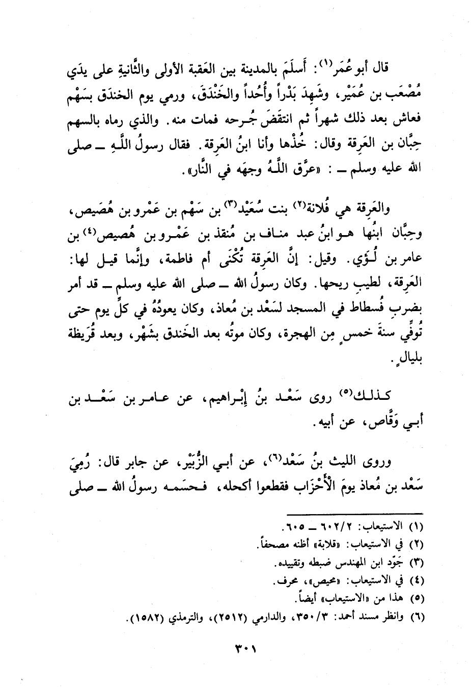وقِيلَ: إن العرقة تكنى أم فَاطِمَة، وإنما قيل لها: العرقة، لطيب ريحها. وكان رَسُول اللَّهِ صلى الله عليه وسلم قد أمر بضرب فسطاط فِي المسجد لسعد بْن معاذ، وكان يعوده فِي كل يوم حَتَّى توفي سنة خمس من الهجرة، وكان موته بعد الخندق بشهر، وبعد قريظة بليال.