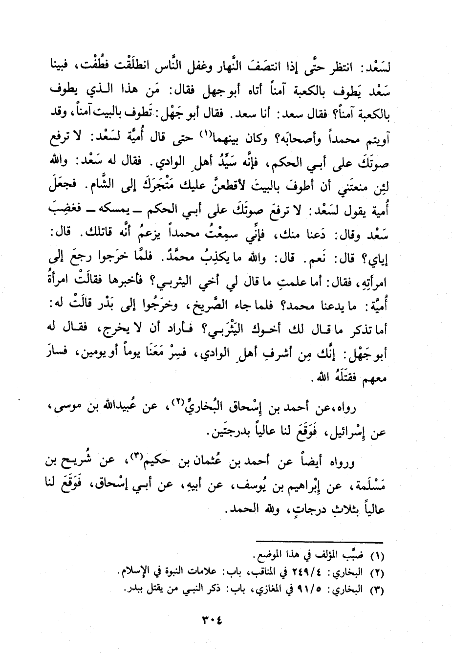لِسَعْدٍ: انْتَظِرْ حَتَّى إِذَا انْتَصَفَ النَّهَارُ وغَفَلَ النَّاسُ انْطَلَقْتَ فَطُفْتَ، فَبَيْنَا سَعْدٌ يَطُوفُ بِالْكَعْبَةِ آمِنًا أَتَاهُ أَبُو جَهْلٍ فَقَالَ: مَنْ هَذَا الَّذِي يَطُوفُ بِالْكَعْبَةِ آمِنًا؟ فَقَالَ سَعْدٌ: أَنَا سَعْدٌ. فَقَالَ أَبُو جَهْلٍ: تَطُوفُ بِالْبَيْتِ آمِنًا، وقَدْ آوَيْتُم مُحَمَّدًا وأَصْحَابَهُ؟ وكَانَ بَيْنَهُمَا (1) حَتَّى قال أُمَيَّةُ لِسَعْدٍ، لا تَرْفَعْ صَوْتَكَ عَلَى أَبِي الْحَكَمِ، فَإِنَّهُ سَيِّدُ أَهْلِ الْوَادِي. فَقَالَ لَهُ سَعْدٌ: واللَّهِ لَئِنْ مَنَعْتَنِي أَنْ أَطُوفَ بِالْبَيْتِ لأَقْطَعَنَّ عَلَيْكَ مَتْجَرَكَ إِلَى الشَّامِ. فَجَعَلَ أُمَيَّةُ يَقُولُ لِسَعْدٍ: لا تَرْفَعْ صَوْتَكَ عَلَى أَبِي الْحَكَمِ - يُمْسِكُهُ - فَغَضِبَ