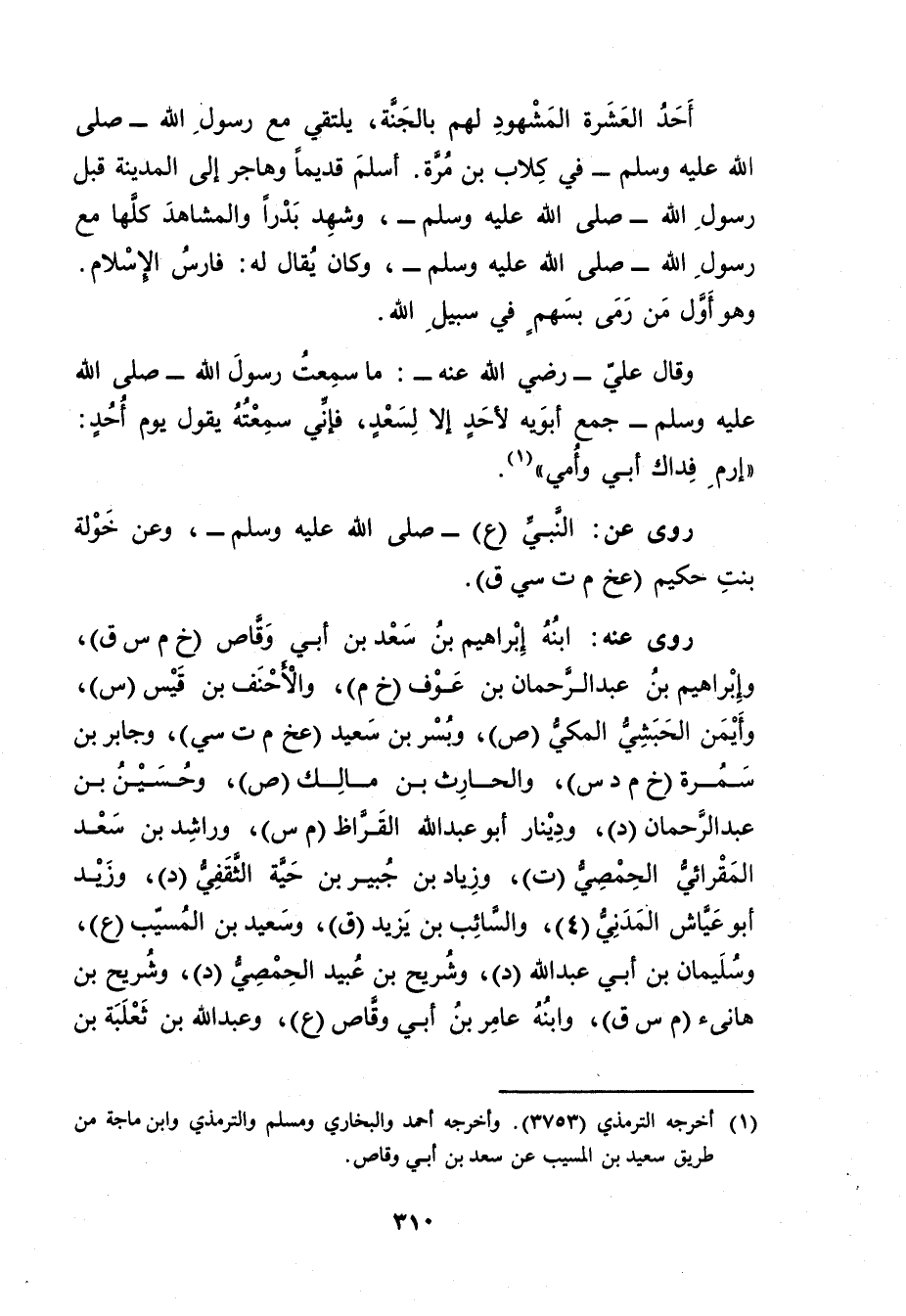(1) أخرجه التِّرْمِذِيّ (3753) . وأخرجه أحمد والبخاري ومسلم والتِّرْمِذِيّ وابن ماجة من طريق سَعِيد بْن المُسَيَّب عَنْ سعد بن أَبي وقاص.
